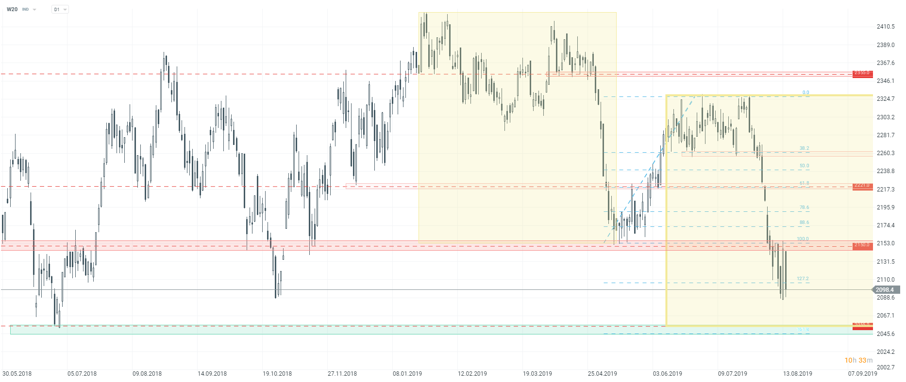 Patrząc na sytuację techniczną, podaż pojawiła się na wysokości wybitej wcześniej strefy przy 2150 pkt. W przeszłości stanowiła ona wsparcie, a po wybiciu zadziałała jako opór. Mieliśmy więc do czynienia z klasyczną zasadą zmiany biegunów - poziom wsparcia stał się oporem. Tak długo jak cena znajduje się poniżej, obowiązuje tendencja spadkowa. Celem dla strony sprzedającej możem być nawet atak na poziom 2055 pkt, o którym wspominaliśmy także w ostatniej analizie. Wsparcie to wynika z minimów z 2018 roku oraz mierzenia zewnętrznego 161,8% ostatniej fali wzrostowej. Poziom ten na pewno nie powinien być obojętny dla kupujących.