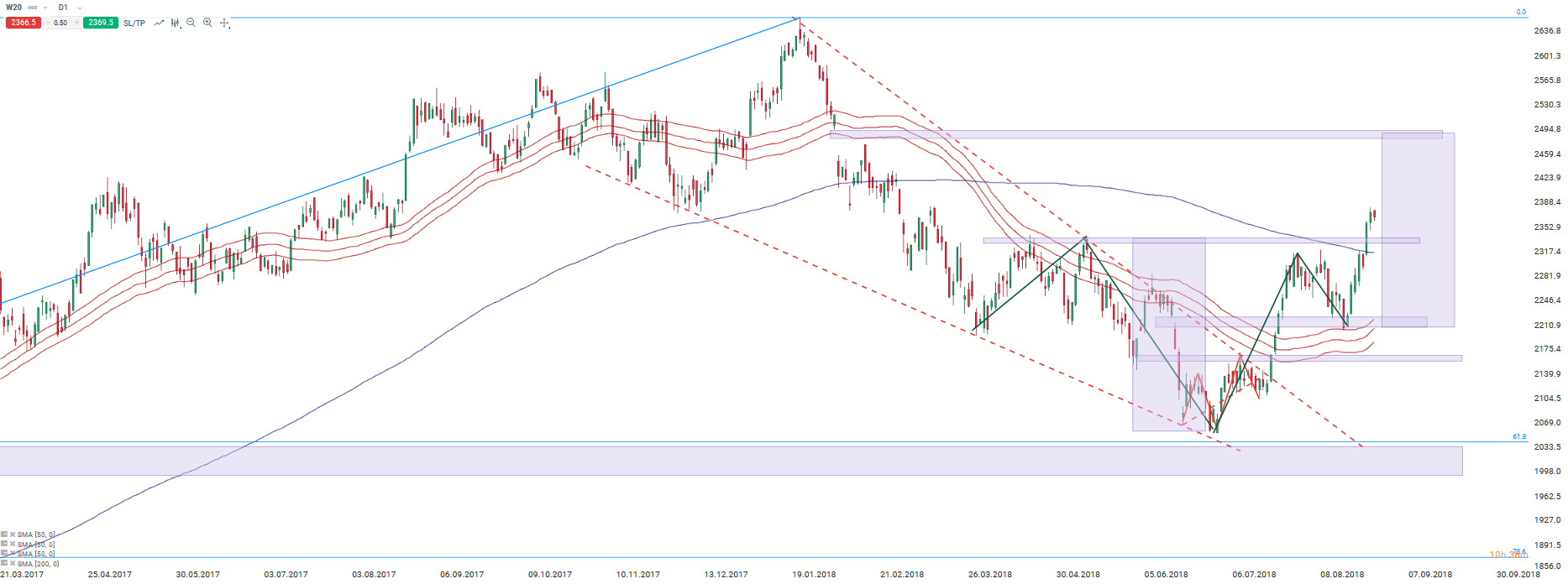 W ujęciu technicznym WIG20 (W20) po silnych wzrostach w poprzednich dniach zatrzymał się pod poziomem 2400 pkt. Biorąc pod uwagę ostatnie ruchy są to rejony, gdzie mogą uaktywnić się niedźwiedzie. Za takim scenariuszem przemawia odreagowanie na dolarze amerykańskim, który w ostatnich godzinach zaczyna odzyskiwać grunt pod nogami. Dodatkowo USDPLN odbija od poziomu 3,64, który stanowił wsparcie w ostatnich miesiącach. W szerszym ujęciu indeks blue chipów w tym tym tygodniu wybił potencjalną linie szyi formacji odwróconej głowy z ramionami. Kolejnym oporem wydają się być okolice luki spadkowej z dnia 6 lutego, która znajduje się w okolicach 2485 pkt. Pierwszym wsparciem dla byków powinny być rejony 2320-2340 pkt., gdzie znajduje się 200-sesyjna średnia krocząca oraz ostatnie maksima.