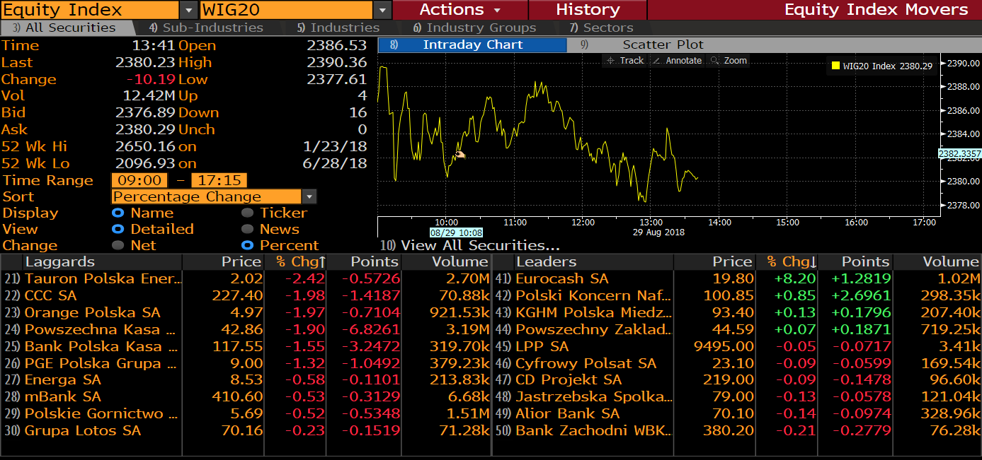 Liderem wzrostów jest dzisiaj Eurocash (EUR.PL), a większość spółek znajduje się pod kreską po ostatnich wzrostach. Źródło: Bloomberg.