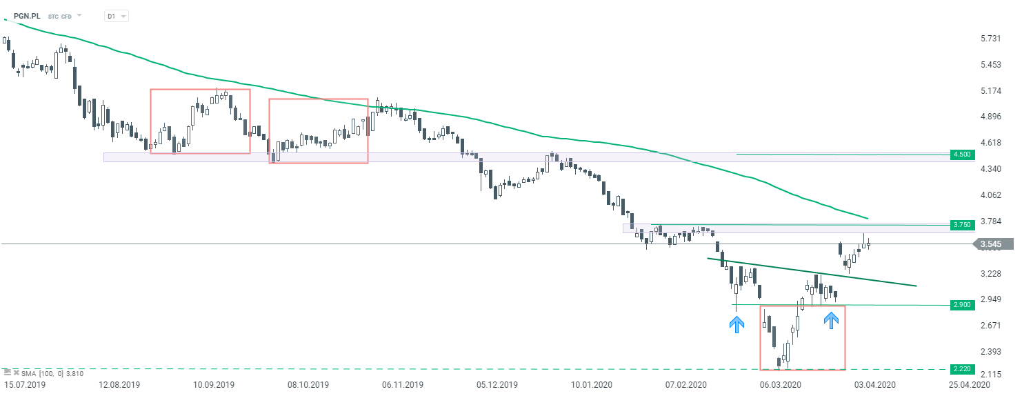 Sytuacja techniczna na spółkach z sektora bankowego nie wygląda najciekawiej, dlatego przyjrzyjmy się spółce PGNiG (PGN.PL). Patrząc na interwał D1, doszło do testu kluczowe strefy oporowej. Obszar zaznaczony kolorem fioletowym przy 3,75 zł wynika z wcześniejszych reakcji ceny, dodatkowo nieco powyżej wypada średnie 100 okresowa, która w ostatnim czasie powstrzymywała większą zwyżkę. NIemniej z drugiej strony na tym samym przedziale czasowym można zauważyć strukturę oRGR (odwrócona głowa z ramionami, co może zachęcać do kupna. Jeżeli wspomniany poziom 3,75 zł zostały wybity, krus mógłby w szybkim tempie przetestować kolejną barierę podażową, która znajduje się przy 4,50 zł. W przeciwnym razie odbicie się od oporu, może doprowadzić do kolejnej fali spadkowej z celem na 2,9 zł, bądź nawet 2,22 zł.