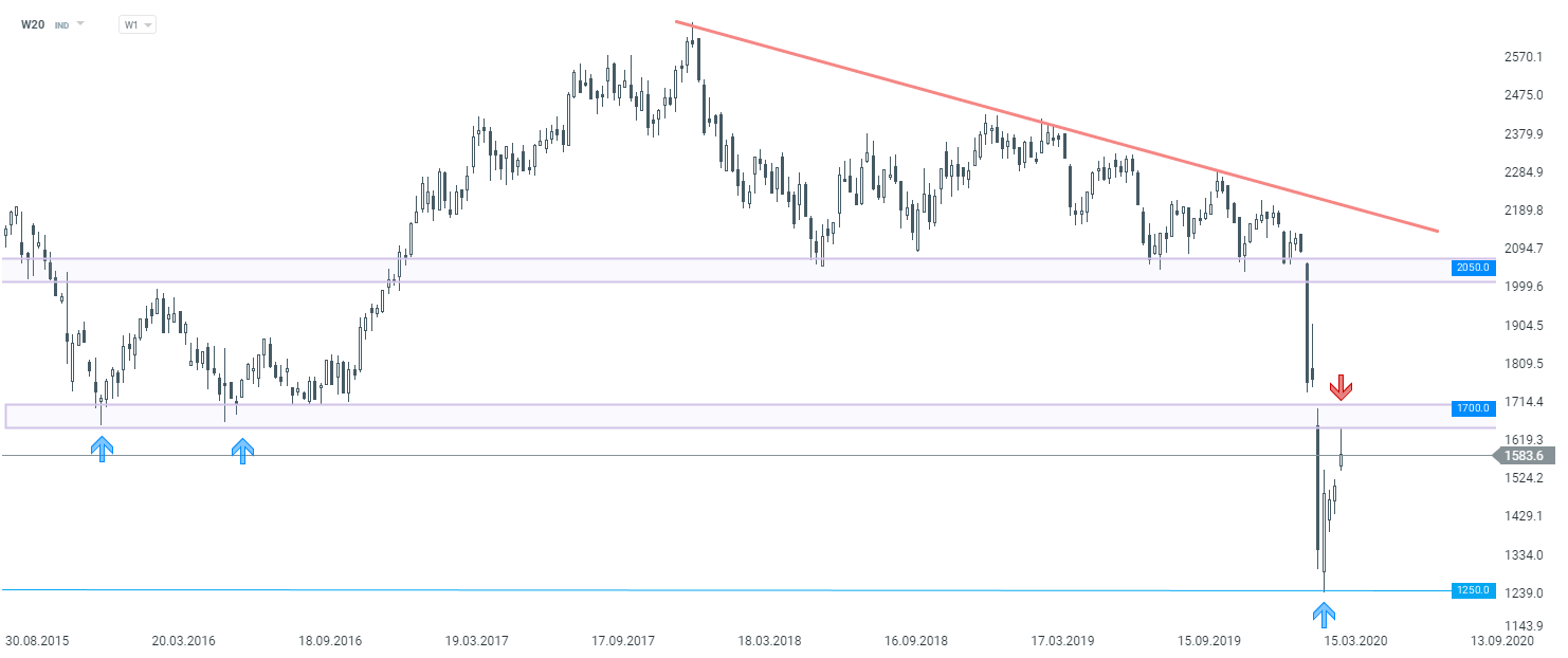 Patrząc z kolei na wykres WIG20 (W20), wczoraj doszło do testu kluczowej strefy oporowej przy 1700 pkt, o której pisaliśmy już od dłuższego czasu. Pomimo, że obecna korekta wzrostowa charakteryzuje się sporą dynamiką, tak dopiero wybicie powyżej strefy zaznaczone na fioletowo może doprowadzić do większego odbicia. W pierwszej kolejności obszar ten powinien stanowić ważną zaporę podażową, Odbicie się w tym miejscu może doprowadzić do wygenerowania kolejnej fali spadkowej z celem nawet na dołki przy 1250 pkt.