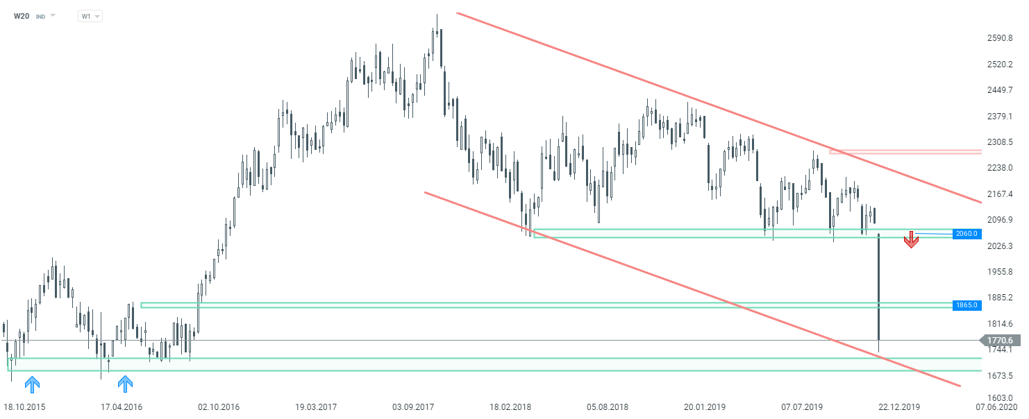 Przecena na indeksie największych polskich spółek pogłębia się. W20 bez większego problemu pokonał wsparcie przy poziomie 1865 pkt, i aktualnie wszystko wskazuje na test strefy przy 1700 pkt, do której poniekąd niewiele już dziś zabrakło. Obszar zaznaczony kolorem zielonym z pewnością nie będzie obojętny dla kupujących. Wystąpienie reakcji popytowej w tych okolicach może doprowadzić do krótkoterminowego odreagowania, niemniej należy pamiętać, że główna tendencja pozostaje spadkowa. Ewentualne wybicie poniżej, może doprowadzić do całkowitej kapitulacji popytu i dalszych spadków. Jednak na tę chwilę poziom powinien być bacznie obserwowany.