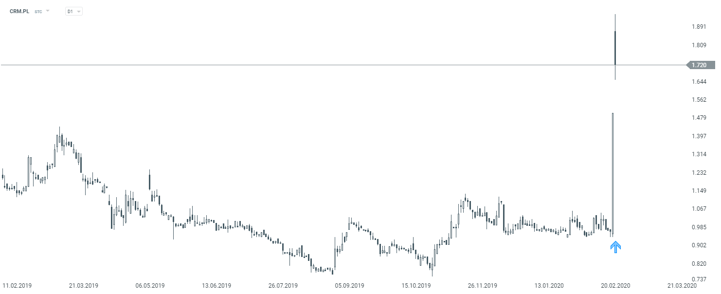 PZ Cormay korzysta na panice związanej z koronawirusem, spóka w pewnej chwili podwoiłą swoją wartość w czasie zaledwie dwóch sesji. CRM.PL interwał D1. Źródło: xStation5