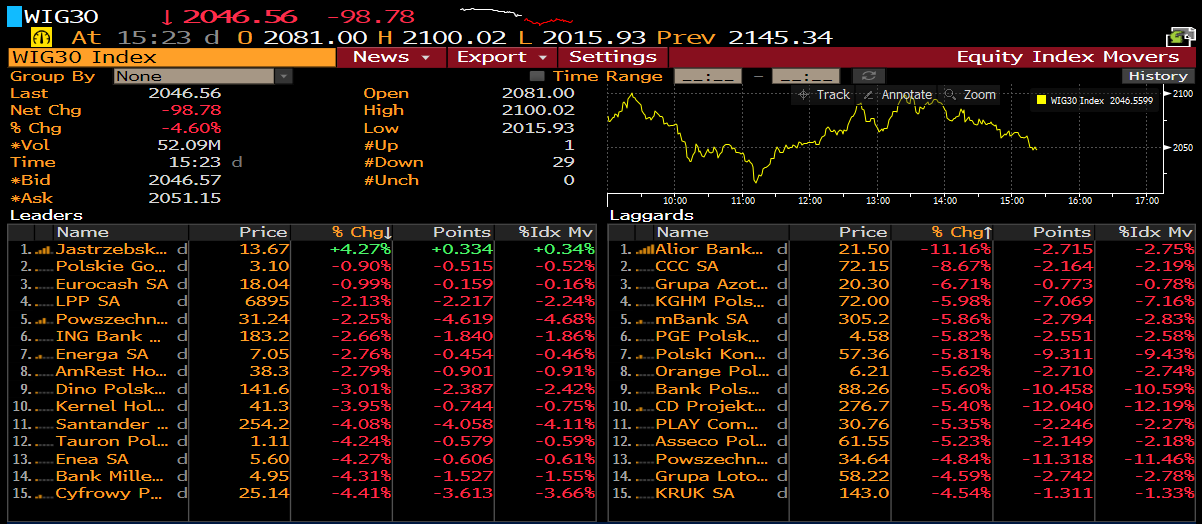Ten tydzień z pewnością przejdzie do historii. Indeks dwudziestu największych spółek na warszawskiej giełdzie ma szansę na zamknięcie się największą przeceną w historii! Czy do tego dojdzie okaże się już po zakończeniu notowań. Z kolei sentyment przez rozpoczęciem sesji w USA jest fatalny, dlatego też ryzyko dalszych spadków w najbliższych godzinach jest bardzo wysokie. Podczas ostatniej sesji w tym tygodniu indeks WIG20 znajduje się ponad 4,5% pod kreską. Rekordzistą jest Alior Bank , który traci aż 11,5%! Co ciekawe odbicie widzimy na JSW, gdzie wzrosty wynoszą 4,2%, jest to jedyna spółka z WIG30 która znajduje się dziś na plusie.