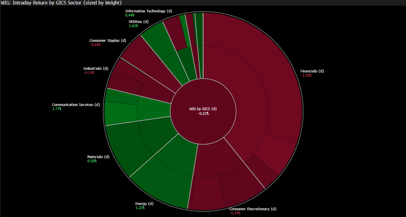 Notowania na Giełda Papierów Wartościowych w Warszawie pozostają pod lekką presją, a przebieg handlu wskazuje na utrzymującą się ostrożność inwestorów i ograniczoną skłonność do podejmowania ryzyka. Źródłem tej postawy pozostaje przede wszystkim niepewność geopolityczna. Przedłużenie rozejmu ogłoszone przez Donalda Trumpa nie przyniosło wyraźnej poprawy nastrojów. Brak komunikacji ze strony Iranu oraz sygnały o wstrzymaniu rozmów pokojowych powodują, że rynek traktuje to porozumienie z dużą rezerwą. Dodatkowo deklaracje amerykańskiej administracji, że zawieszenie broni ma obowiązywać do czasu zakończenia negocjacji, nie stanowią dla inwestorów wystarczająco wiarygodnej kotwicy stabilizacyjnej, przez co globalny sentyment pozostaje kruchy.