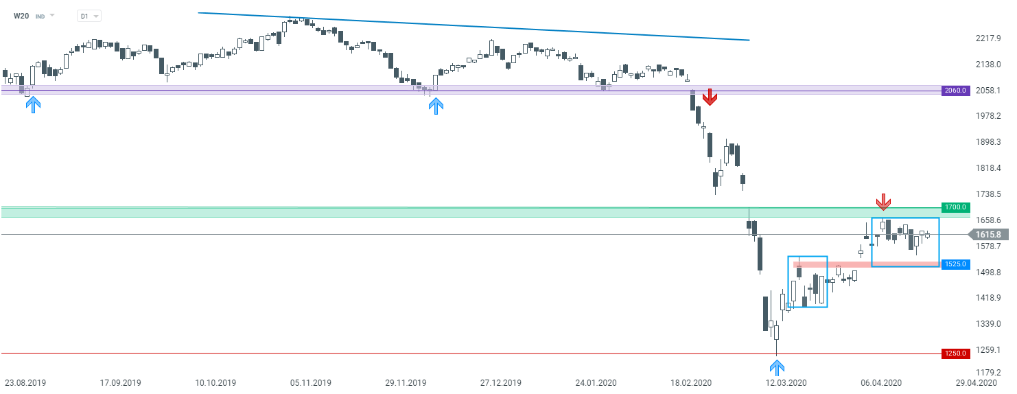 Patrząc z kolei na sytuację na indeksie WIG20 (W20) właściwie nie uległa ona żadnej zmianie. Wciąż kluczowym oporem pozostaje strefa przy 1700 pkt. Jeśli chodzi natomiast o przedział czasowy D1, kluczowym wsparciem jest strefa przy 1525 pkt. Miejsce to wynika z wcześniejszych lokalnych reakcji cenowych oraz dolnego ograniczenia układu 1:1. Jeżeli poziom zostałby złamany, ruch w dół może przyspieszyć. W przypadku takiego scenariusza możliwy jest nawet ruch w kierunku ostatnich minimów przy 1250 pkt. Cały czas należy pamiętać, że główny trend pozostaje spadkowy.