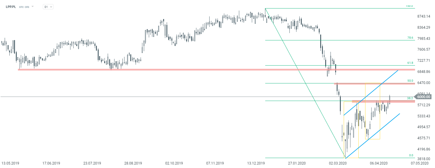 W dzisiejszej analizie przyjrzymy się sytuacji LPP (LPP.PL). W jednym z ostatnich artykułów wspominaliśmy, że kurs coraz mocniej napiera na opór przy mierzeniu 38,2% Fibonacciego. Dziś opór ten został pokonany i niewykluczone, że korekta wzrostowa rozszerzy się w kierunku kolejnego współczynnika Fibo. Warto też zauważyć, że kolejne zniesienie grupuje się z geometrią 1:1, która została zaznaczona kolorem żółtym. Miejsce to powinno stanowić kluczową barierę podażową.
