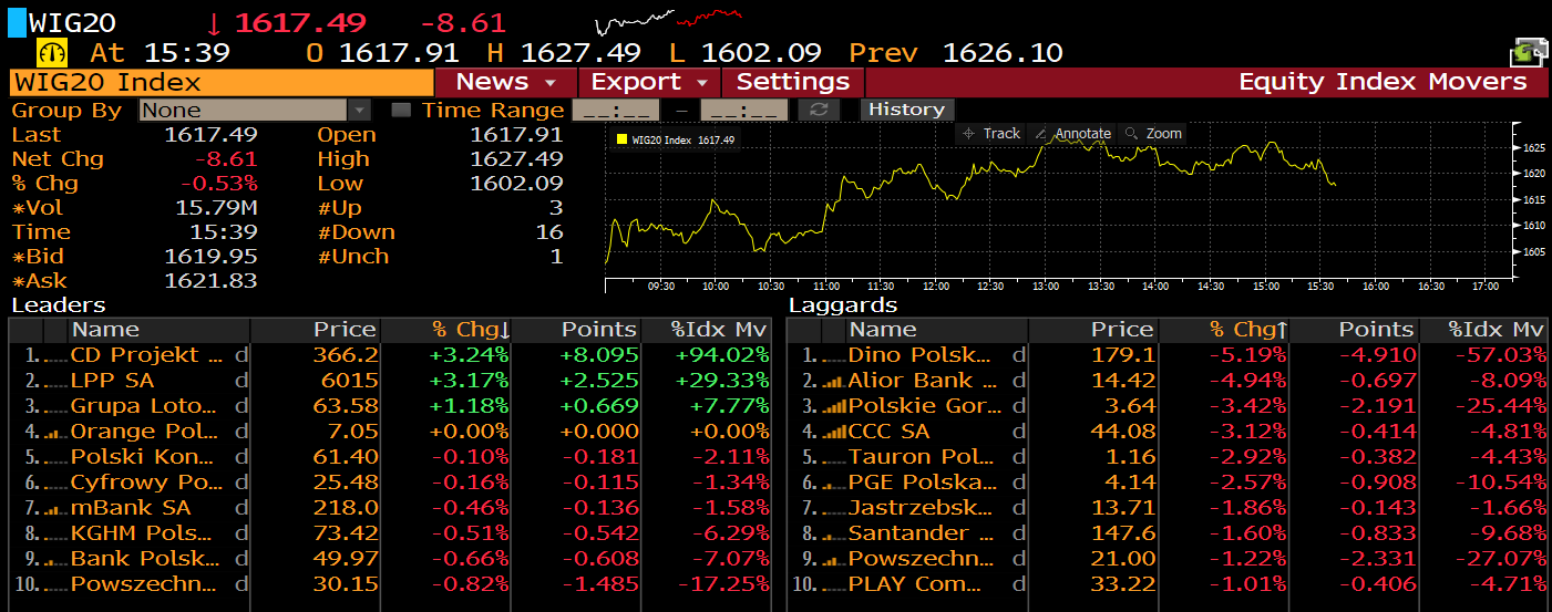 Niemniej jak widać po przebiegu dzisiejszego dnia, rynki jedynie chwilowo przejęły się negatywnymi wynikami badań. Po niższym otwarciu dalsza część sesji przebiega pod kątem odrabiania strat. Indeksy w Europie dalej znajdują się pod kreską, niemniej nie widać znacznej paniki. Indeks dwudziestu największych spółek w Polsce notuje -0,8% tuż po starcie handlu w USA (który rozpoczyna się od spadków). Wśród blue chipów jedynie 3 walory znajdują się na plusie, pozostałe 17 traci. Podobnie jak wczoraj, słabo radzi sobie sektor bankowy. Z kolei najmocniejsze spadki możemy obserwować na akcjach Dino Polska (DNP.PL), gdzie wczoraj doszło do ustanowienia najwyższych poziomów w historii. Warto jednak też wspomnieć o pozytywach, dziś CD Projekt (CDR.PL) podbił kolejne rekordy, cena za jedną akcję przekroczyła poziom 370 zł. Jak widać branża gamingowa jest odporna na koronawirusa.