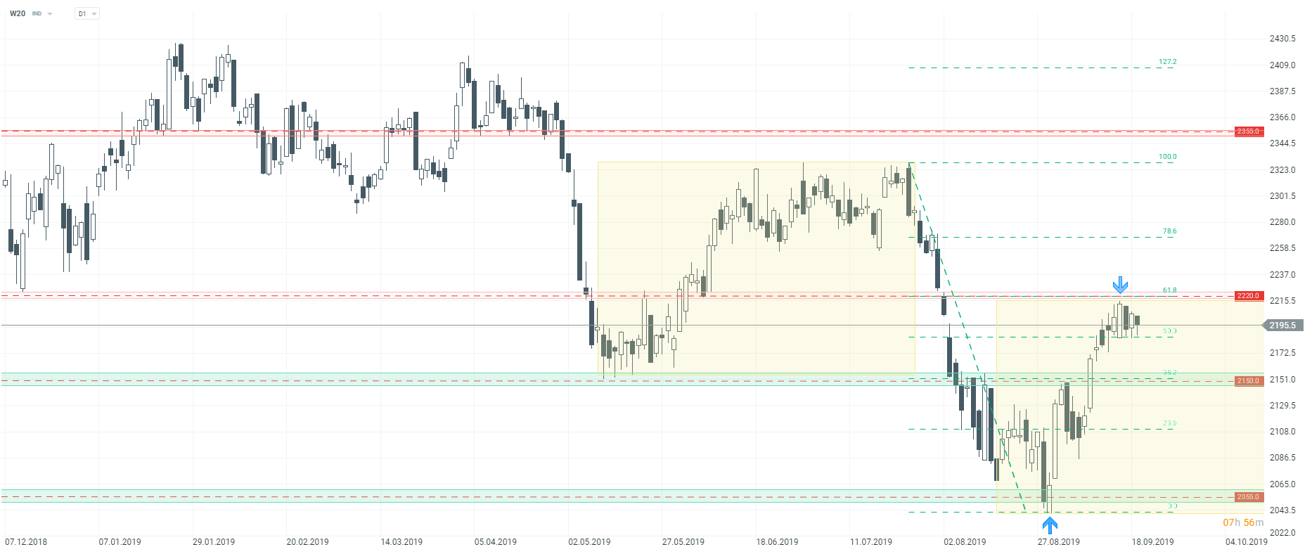Spoglądając na wykres indeksu 20- stu największych spółek, widać, że kurs utknął pod kluczowym oporem przy 2220 pkt. W ostatnim czasie cena ma wyraźny problem z pokonaniem tego miejsca. Z drugiej strony większe spadki są powstrzymywane przez lokalne wsparcie przy 2185 pkt, które wynika z biegunowości pokonanego wcześniej współczynnika 50% Fibonacciego. Aby doszło do większych ruchów na tym indeksie, cena musiałaby pokonać wspomniany opór, bądź wsparcie. Jeśli doszłoby do spadków, należy pamiętać o kluczowym wsparciu przy 2150 pkt, poziom ten w ostatnim czasie był istotny zarówno dla kupujących jak i sprzedających, wypadają tu między innymi dołki z maja tego roku.