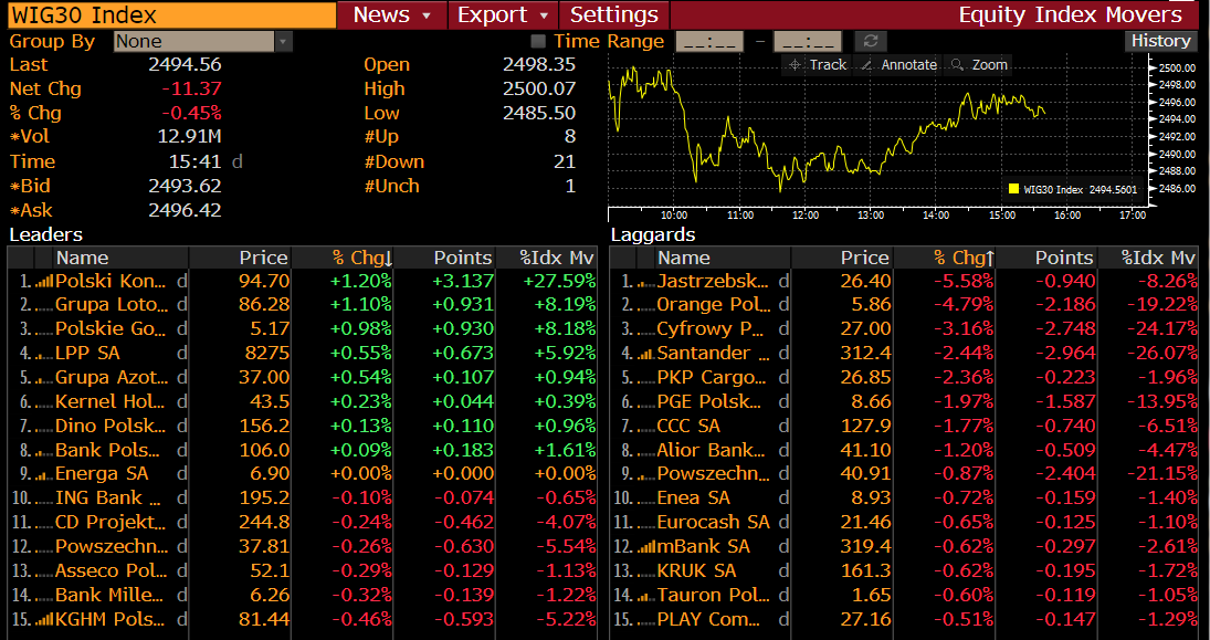 Spółki z indeksu WIG30 przed godziną 16:00. Źródło: Bloomberg