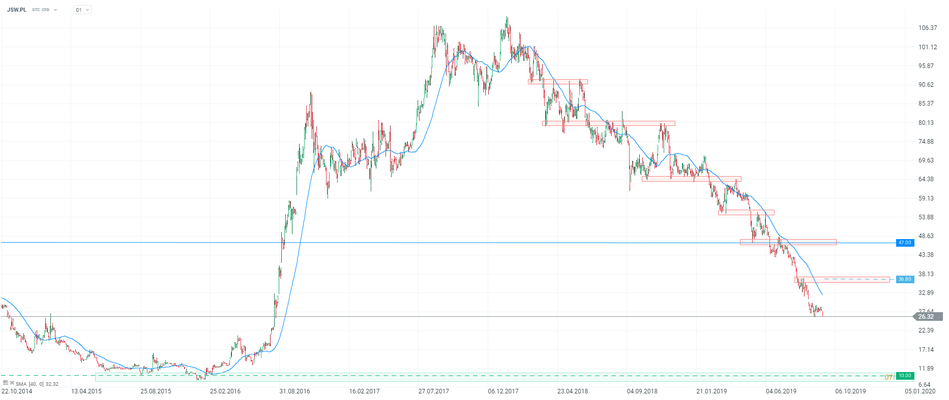 Jedną z najgorzej radzących sobie dziś spółek jest Jastrzębska Spółka Węglowa (JSW.PL), której notowania nurkują dziś blisko 6%. Dziś poznaliśmy informację, że spółka planuje uruchomienie pierwszej ściany w nowej kopalni Bzie-Dębina w 2022 r. Zatrudnienie w kopalni ma wynieść wtedy 800 osób, a docelowo ponad ma to być nawet 2000 osób. W komunikacie można przeczytać, że aktualnie pracują już 223 osoby, a z końcem roku będzie ich 300. Wiadomość nie pomaga jednak we wzrostach, wręcz przeciwnie ruch w dół przyspiesza. Patrząc na wykres brakuje punktu zaczepienia, aby poszukać wsparć należy maksymalnie oddalić wykres. Jak widać na interwale D1 kurs jest na dobrej drodze do spadków w okolice minimów z 2016, gdzie po chwilowej konsolidacji rozpoczęła się prawdziwa hossa. Aktualnie najlepszym wyjściem wydaje się więc cierpliwe czekanie na spadki nawet w rejony poziomu 10 zł. Miejsce to na pewno nie powinno być obojętne dla rynkowych byków.