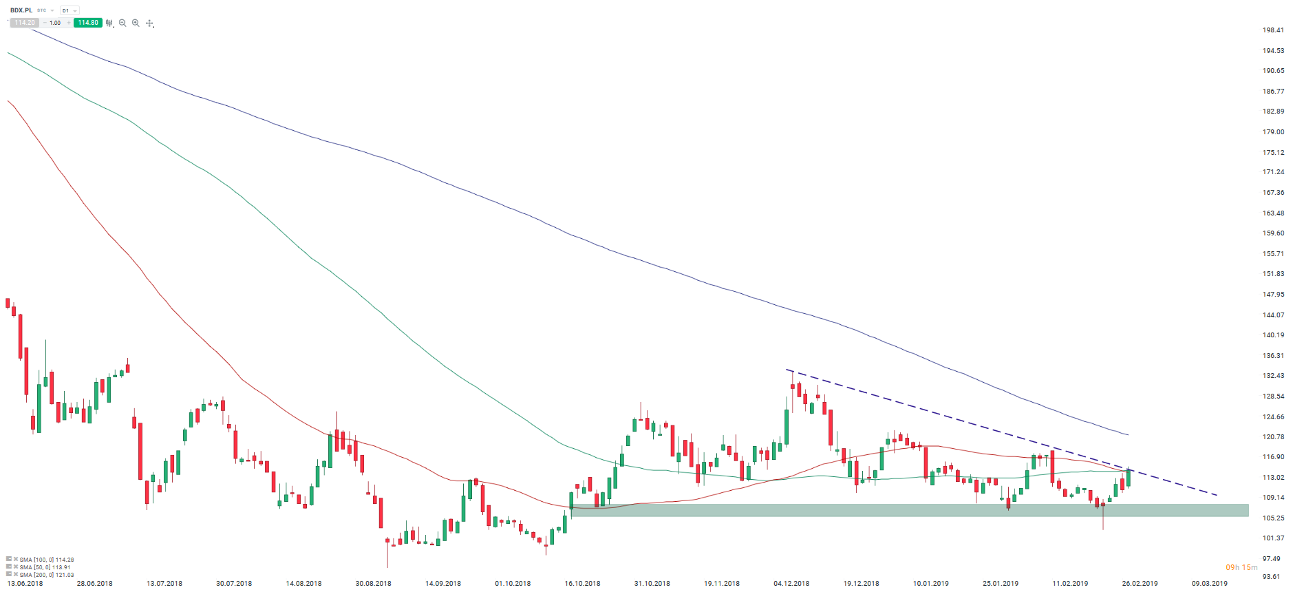 Swoje wyniki za IV kwartał opublikował również Tauron (TPE.PL). Wyniki były nieco lepsze od konsensusu. Przychody wzrosły o 6,1% r/r do 4,82 mld złotych (oczekiwano: 4,7 mld zł.). Z kolei EBITDA spadła o 11% do 617 mld złotych. Negatywnie odbierać można z pewnością najwyższą od 3 lat stratę w segmencie wydobycie, pomimo solidnych danych sprzedażowych. Nakłady inwestycyjne wzrosły o 7,2% do 1,347 mld złotych. Tauron po wynikach delikatnie traci, jednak cały czas pozostaje w okolicach oporu na poziomie 2,45 złotych.