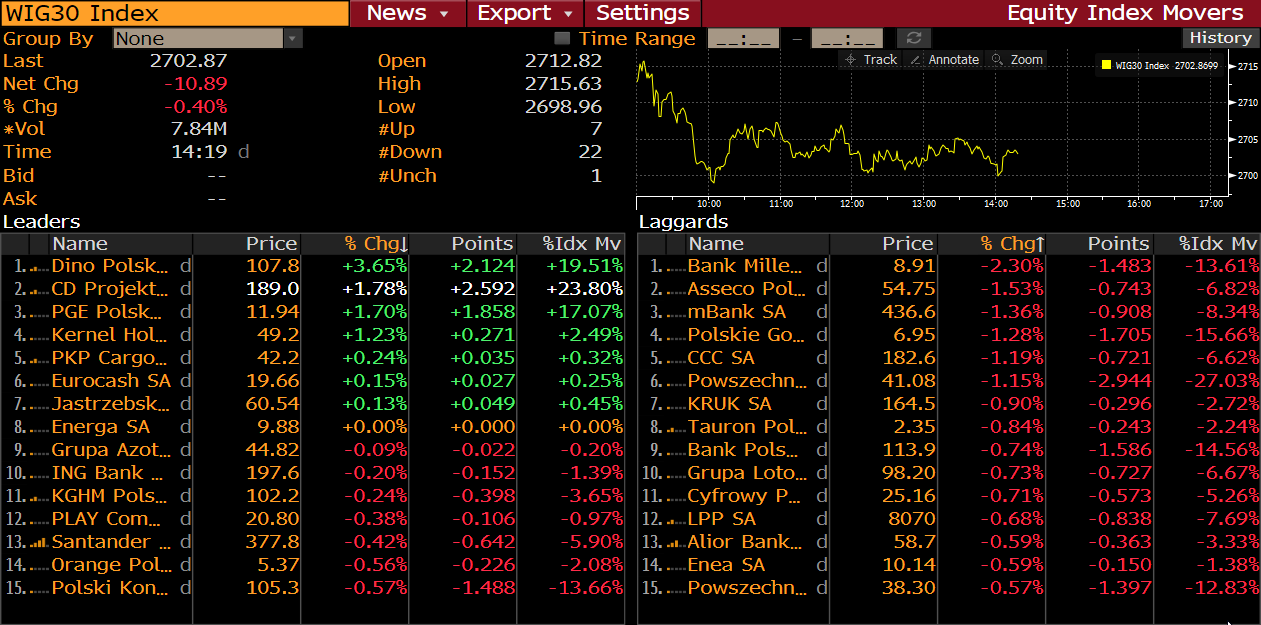 Dino PL (DNP.PL) w ostatnim czasie radzi sobie bardzo dobrze. Na pochwałę zasługują również walory CD Projekt (CDR.PL), które zbliżają się w rejon psychologicznych 200 złotych. Źródło: Bloomberg.