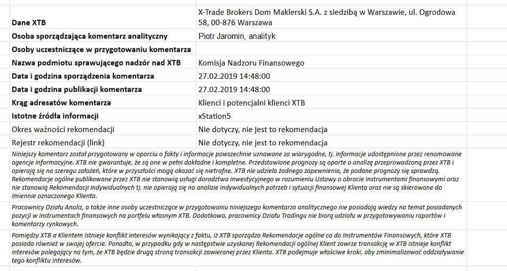 Ta publikacja handlowa jest informacyjna i edukacyjna. Nie jest rekomendacją inwestycyjną ani informacją rekomendującą lub sugerującą strategię inwestycyjną. W materiale nie sugerujemy żadnej strategii inwestycyjnej ani nie świadczymy usługi doradztwa inwestycyjnego. Materiał nie uwzględnia indywidualnej sytuacji finansowej, potrzeb i celów inwestycyjnych klienta. Nie jest też ofertą sprzedaży ani subskrypcji. Nie jest zaproszeniem do nabycia, reklamą ani promocją jakichkolwiek instrumentów finansowych. Publikację handlową przygotowaliśmy starannie i obiektywnie. Przedstawiamy stan faktyczny znany autorom w chwili tworzenia dokumentu. Nie umieszczamy w nim żadnych elementów oceniających. Informacje i badania oparte na historycznych danych lub wynikach oraz prognozy nie stanowią pewnego wskaźnika na przyszłość. Nie odpowiadamy za Twoje działania lub zaniechania, zwłaszcza za to, że zdecydujesz się nabyć lub zbyć instrumenty finansowe na podstawie informacji z tej publikacji handlowej. Nie odpowiadamy też za szkody, które mogą wynikać z bezpośredniego czy też pośredniego wykorzystania tych informacji. Inwestowanie jest ryzykowne. Inwestuj odpowiedzialnie.