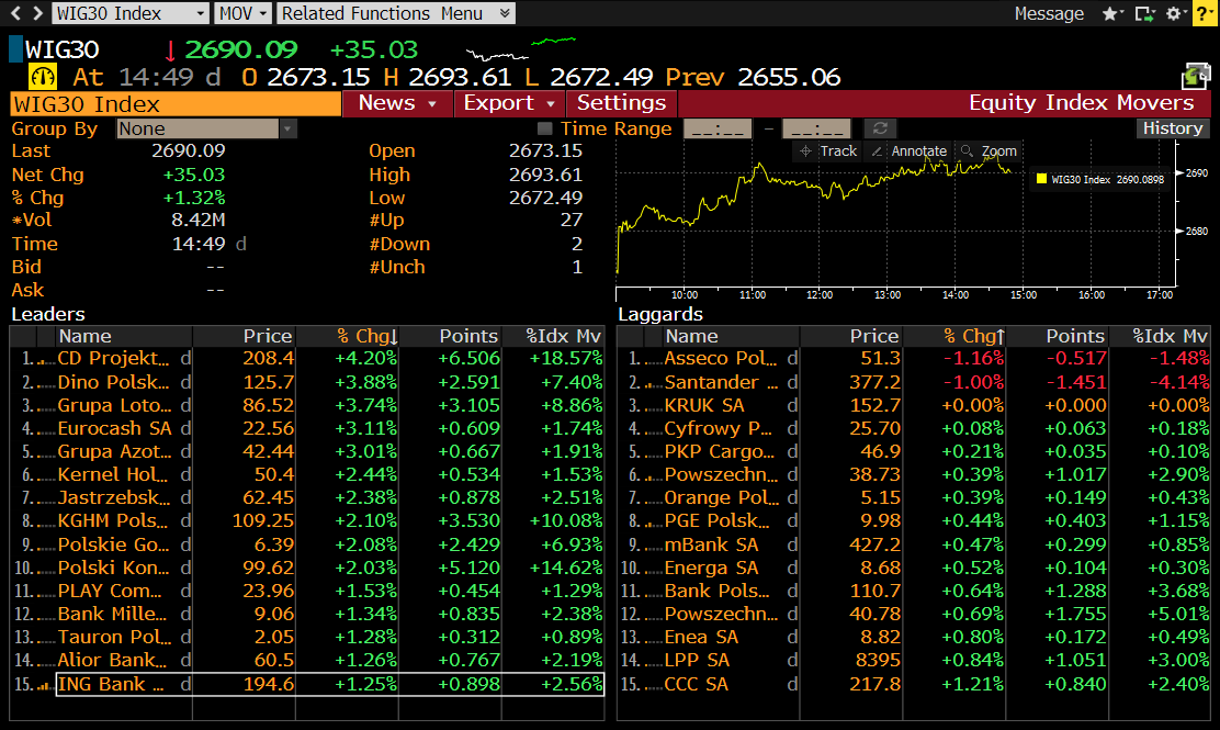 W WIG30 najmocniej rośnie CD Projekt (CDR.PL), który oddala się od okrągłego poziomu 200 złotych za 1 akcję. W MWIG40 najlepiej radzi sobie walory GPW (GPW.PL), które zyskują ponad 6%. Źródło: Bloomberg.