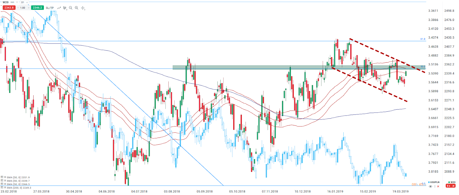 Niedźwiedzie po raz kolejny mają problem z pokonaniem poziomu 2300 pkt. na WIG20 (W20). Obecnie indeks kieruje się ponownie w rejon jego górnego ograniczenia. Źródło: xStation5.