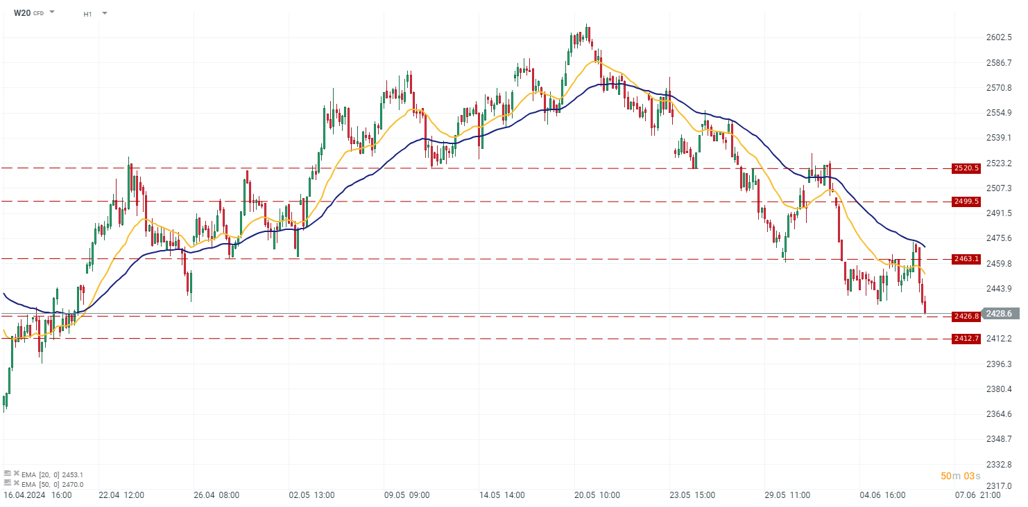 Kontrakt na indeks WIG20 (W20) w interwale 1H wraca dziś do poziomów z połowy kwietnia, wyznaczając nowe lokalne minima. Kurs zbliża się do ograniczenia kanału bocznego na poziomie 2426,8 pkt. Przebicie tego poziomu wsparcia skieruje uwagę inwestorów na poziom 2412 pkt., co stanowi mocne wsparcie wyznaczone przez minima kwietniowe oraz szczyty lokalne z końcówki marca. W przypadku odwrócenia nastrojów ograniczeniem górnym dalej pozostaje poziom 2463 pkt., jednakże sentyment rynkowy na razie nie zapowiada jego trwałego przebicia. Źródło: xStation