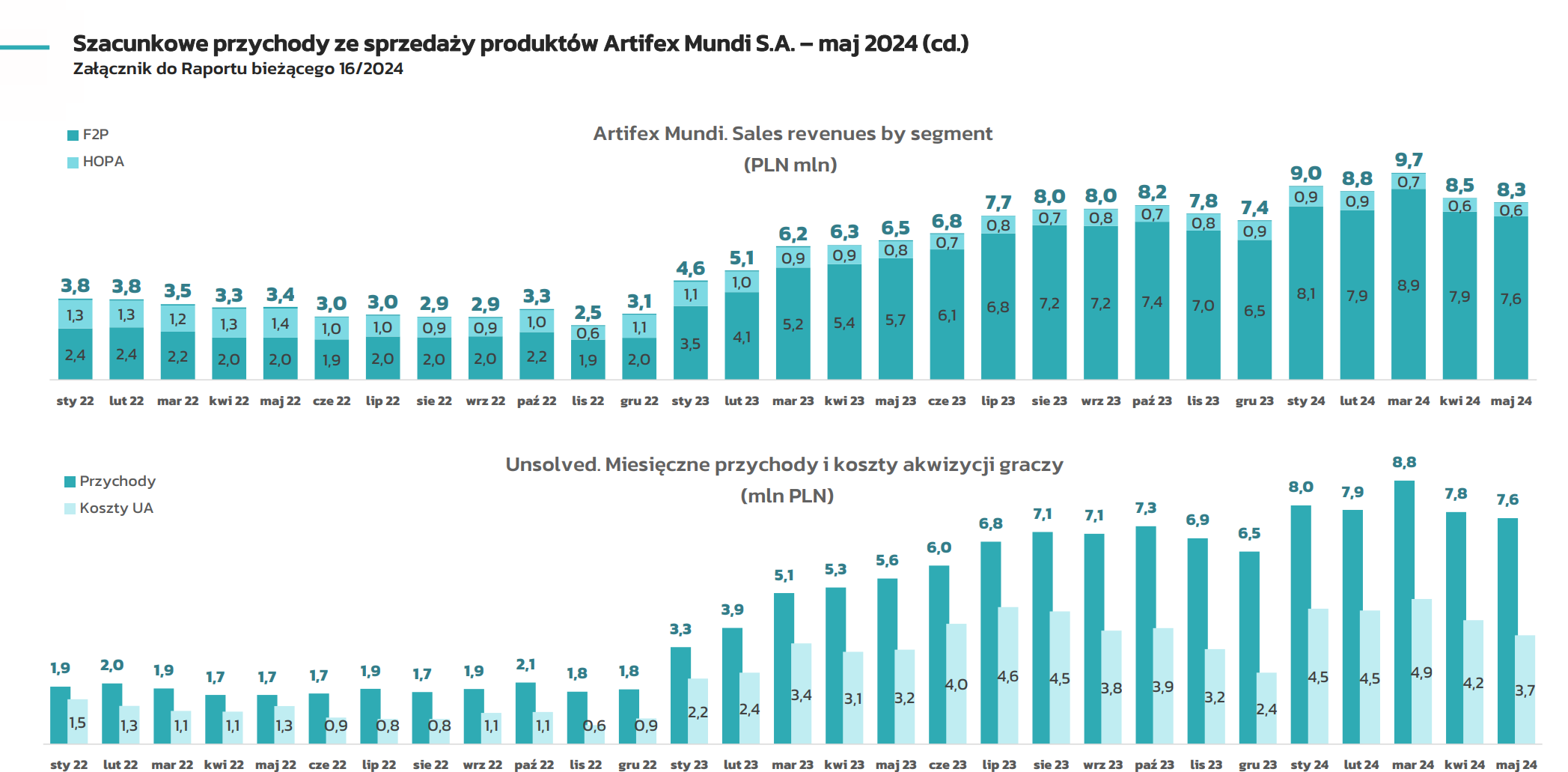 - Artifex Mundi (ART.PL) zaprezentowało dane sprzedażowe za maj 2024 r. W ujęciu m/m sprzedaż kontynuuje trend spadkowy zapoczątkowany od marca 2024 r., kiedy to miesięczne przychody spółki osiągnęły rekordową wartość. Jest to spowodowane przede wszystkim przychodami generowanymi przez aplikację Unsolved, która stanowi ponad 90% całych przychodów spółki. Spadki w przychodach są mocno powiązane z wahaniami wydatków na UA, które spółka również ogranicza od początku tego kwartału. Warto jednak zauważyć, że efektywność pozyskiwania klientów i podtrzymania bazy graczy jest dużo wyższa niż rok wcześniej. Koszty UA w ujęciu r/r wzrosły o 15%, a przychody wzrosły o ponad 35% r/r.
