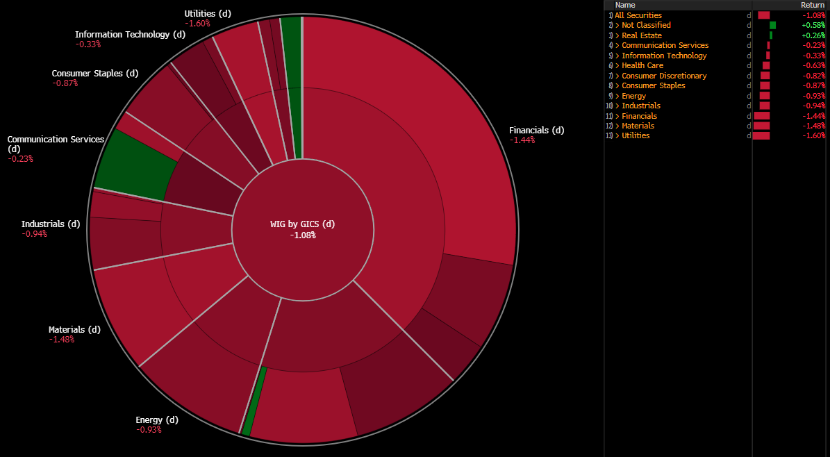 Polska giełda powraca dziś do stref spadków. WIG notuje mocną przecenę o ponad 1%, przy spadkach w prawie wszystkich sektorach. Najmocniej ciążą na indeksie spółki zajmujące się materiałami i instytucje finansowe. Oba sektory notują ponad 1,4% przecenę. Jedynym sektorem ze wzrostami jest sektor nieruchomości z jedynie 0,3% wzrostem.