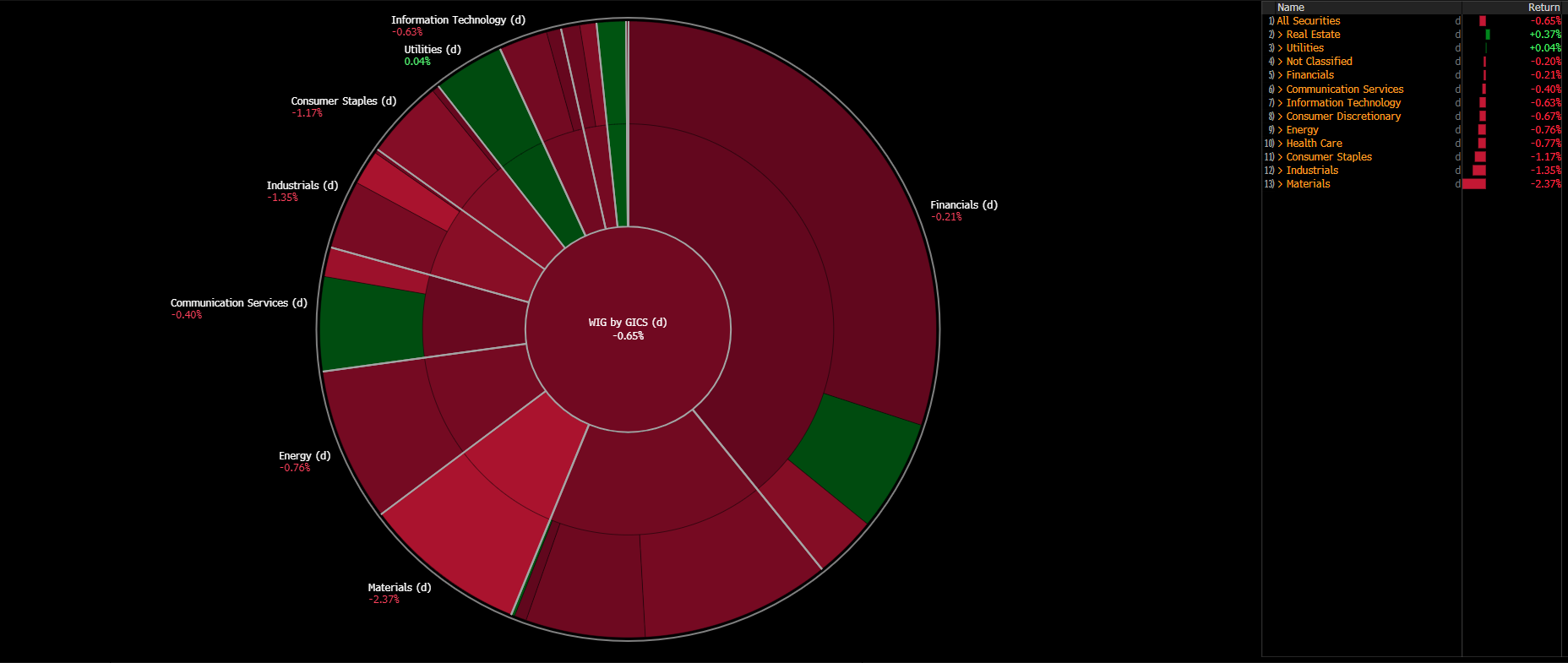 Na polskiej giełdzie dominuje dzisiaj czerwień. Najsłabiej radzą sobie dzisiaj największe indeksy: WIG20 oraz WIG, tracące ok. 0,7%. W przypadku indeksu blue chipów straty notują prawie wszystkie spółki. W szczególności słabo radzi sobie KGHM z -3,4% stratą. Notowania spółki są mocno zależne od rynku miedzi, który od początku października pozostaje pod presją spadkową. Dziś mocniej traci także Pepco (-2,3%) oraz Orange Polska (-2,2%). Jedyne wzrosty notują dziś PKO (+0,5%) oraz CD Projekt (+0,3%). Poza nimi spółki z sektora finansoweg pozostają na niewielkich plusach, choć ich wartość na razie fluktuuje w okolicach ceny zamknięcia z poprzedniej sesji.