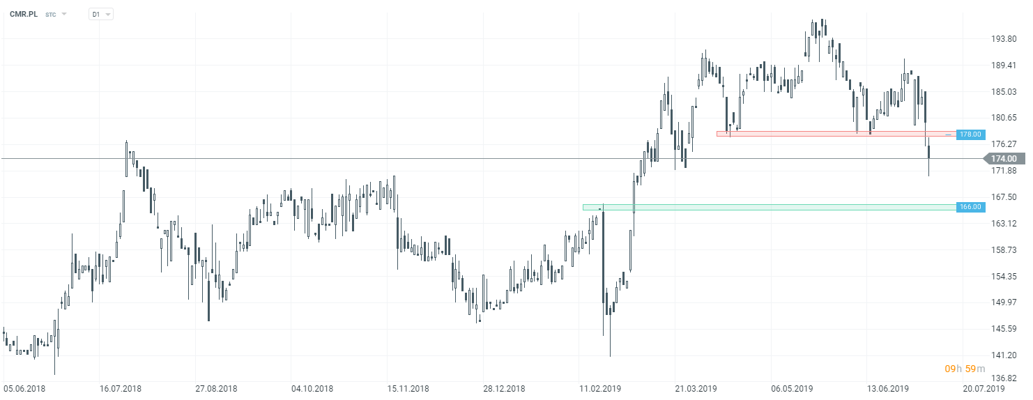 Patrząc na najsłabsze spółki, należy wziąć pod uwagę Comarch (CMR.PL). Fundamentalnie, nie pojawiły się żadne informacje, które spowodowałoby tak dużą przecenę. Wydaje się, że spadki są napędzane poprzez wybicie kluczowego poziomu technicznego. Mianowicie doszło do wyłamania linii szyi, klasycznej formacji głowy z ramionami. Aktualnie istnieje szansa na spadki nawet w okolice 166 zł, gdzie wypada wsparcie wynikające z poziomu reakcji z lutego. Tak długo jak kurs znajduje się poniżej strefy przy 178 zł, obowiązuje tendencja spadkowa.