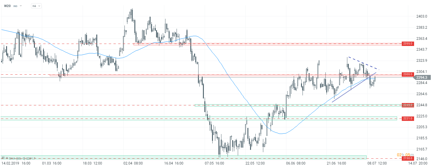 Jeśli chodzi o sytuację techniczną, indeks WIG20 (W20) utrzymuje się poniżej poziomu 2300 pkt, który powinien stanowić najbliższy opór. Jeżeli spadki się pogłębiają, niewykluczony jest nawet ruch w kierunku 2245 pkt, gdzie znajduje się kluczowe wsparcie. Wzrostów można się spodziewać dopiero w momencie pokonania przerywanej fioletowej linii, która została poprowadzona po ostatnich lokalnych szczytach.