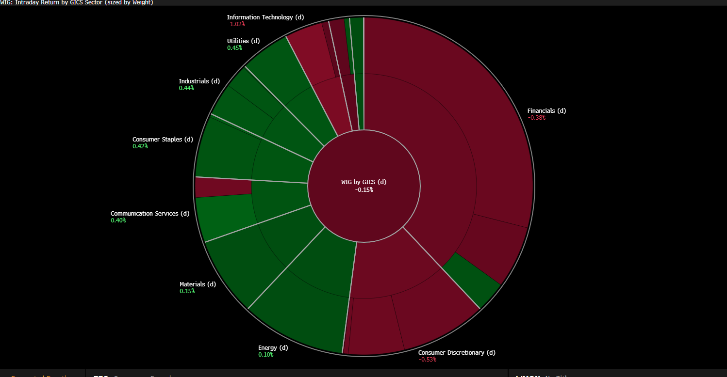 Na dzisiejszej sesji, słabo radzą sobie dziś banki oraz IT. W górę indeks ciągną natomiast niektórzy detaliści oraz przemysł.