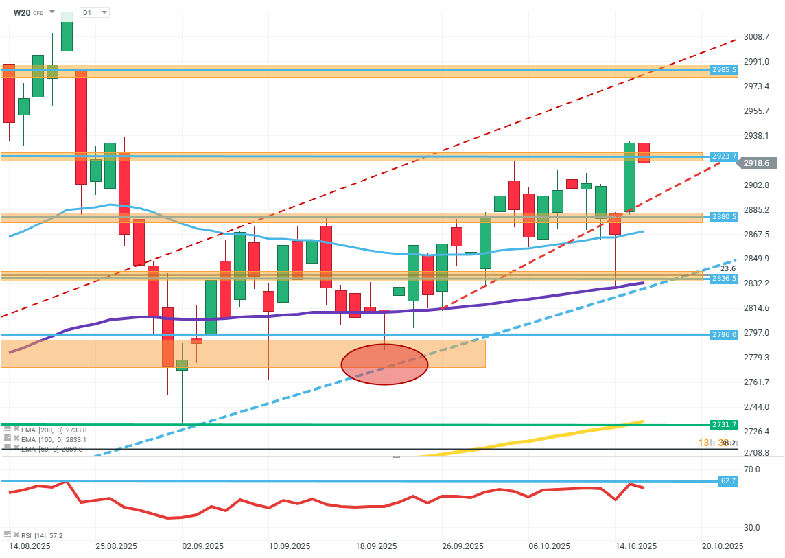 Cena na wykresie chwilowo przebiła opór w okolicach 2920, jednak ma problem z utrzymaniem tego poziomu. Na chwilę obecną obrona linii trendu wzrostowego (czerwona) pokazuje, że kupujący nie dają za wygraną, lecz aby rozpatrywać dalsze scenariusze wzrostowe, kurs musi pokonać i obronić strefę oporu w okolicy 2920 - na co czasu jest coraz mniej z uwagi na przecięcie się z linią trendu. Na korzyść kupujących działa struktura średnich kroczących oraz umiarkowany poziom wskaźnika RSI. Jeśli sprzedający przejmą inicjatywę, prawdopodobna jest korekta kursu w okolicę 2830 gdzie znajduje się również wsparcie z tytułu FIBO 23.6 oraz średnia EMA100.