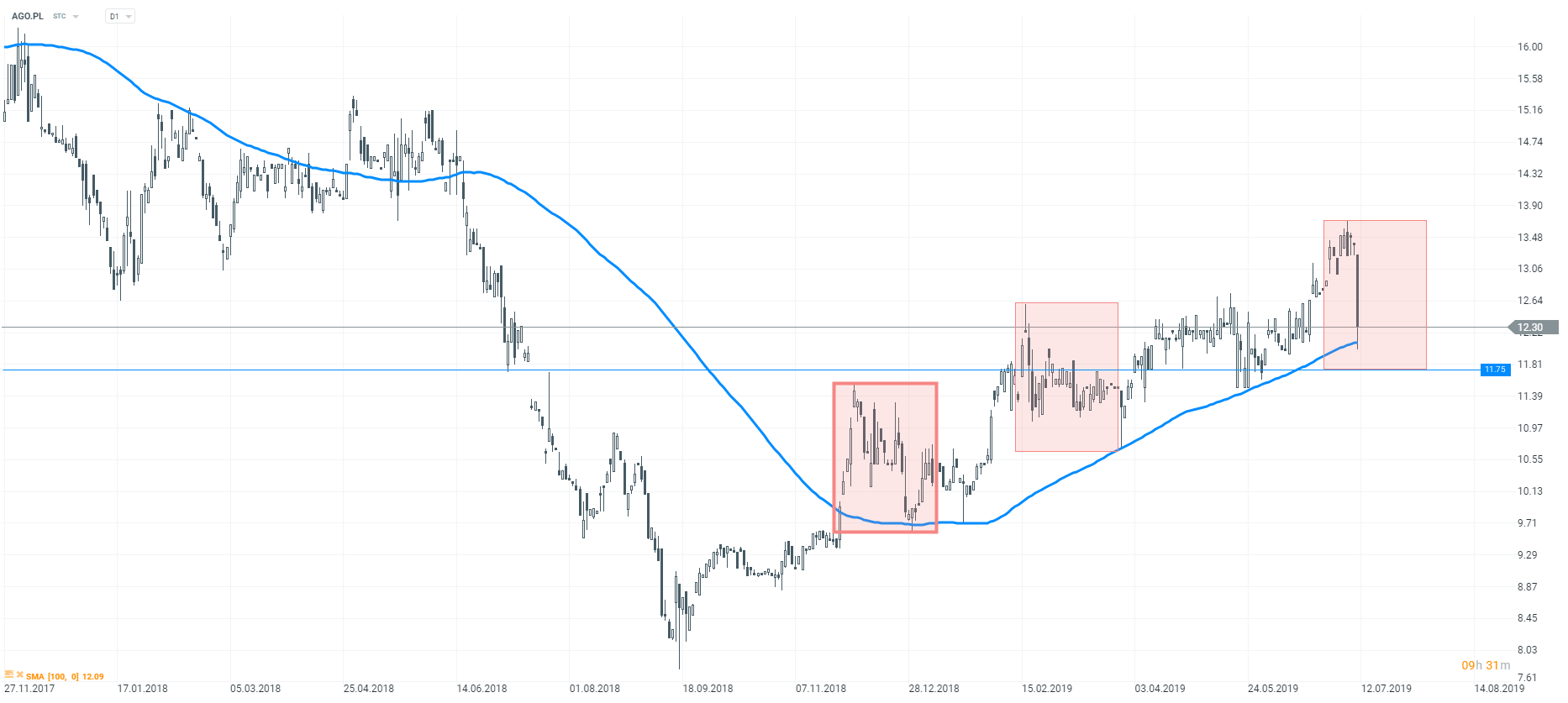 Wśród najmocniej tracących spółek, należy wyróżnić Agorę (AGO.PL), która traci dziś ponad 6%. Nie jest to spółka z dużą kapitalizacją, niemniej w ostatnim czasie widać techniczne zachowanie kursu. Od dłuższego czasu cena utrzymuje się powyżej średniej kroczącej z ostatnich 100 okresów. Na dzisiejszych spadkach doszło do przetestowania średniej, gdzie pojawiała się pierwsza reakcja popytu. Granicznym poziomem dla tendencji wzrostowej, jaką obserwujemy od września 2018 roku, jest dolne ograniczenie układu Overbalance. Kluczowym poziomem jest więc 11,75 zł za jedną akcję. Jego wybicie będzie oznaczało załamanie trendu wzrostowego.