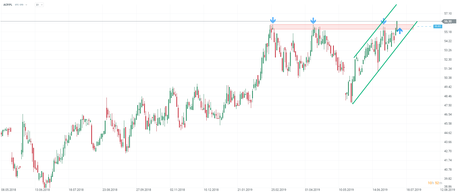 Podczas dzisiejszej sesji warto przyjrzeć się spółce Asseco Poland (ACP.PL). W czwartek możemy obserwować najwyższe poziomy od początku roku, dziś są to wzrosty na ponad +2%. Z perspektywy analizy technicznej doszło do pokonania kluczowej zapory podażowej, co może otwierać drogę dalszego ruchu w górę. Na interwale D1 możemy obserwować wybicie kluczowego poziomu oporu (oczywiście jeśli cena utrzyma się na tych, bądź wyższych poziomach do końca sesji). Patrząc wstecz, rynek miał wyraźny problem z pokonaniem strefy przy 55,8 zł, zanim doszło do wybicia, kurs odbijał się od tego poziomu trzykrotnie. Potwierdza się więc zasada, że im dłużej rynek testuje dane wsparcie/opór, tym większa szansa/ryzyko wybicia. Dzisiejsze wyjście górą może skutkować kontynuacją zwyżki. Wybita strefa powinna teraz, zgodnie z zasadą biegunowości, stanowić wsparcie.
