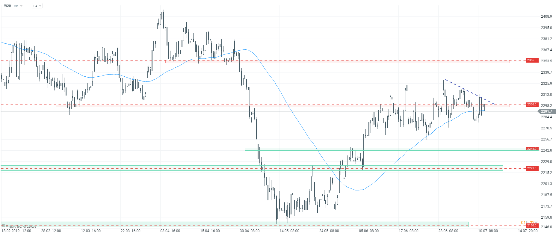 Jeśli chodzi o sytuację techniczną, to instrument W20 ponownie wyszedł powyżej poziomu 2300 pkt, a następnie wrócił poniżej. Konsolidacja trwa więc w najlepsze, dlatego na razie trzeba się wstrzymać z podejmowaniem decyzji inwestycyjnych. Do czasu, aż rynek nie określi wyraźnego kierunku, kurs może poruszać się w ruchu bocznym. Średnia krocząca z ostatnich 60 okresów, która jeszcze kilka dni temu trzymała lokalną tendencję wzrostową, jest wybijana zarówno z jednej, jak i drugiej strony, co potwierdza konsolidację. W szerszej perspektywie należałoby zaczekać na test strefy oporowej przy 2355 pkt, bądż na zejście do wsparcia przy 2245 pkt. Zanim cena wpadła w konsolidację, obowiązywała tendencja wzrostowa, co może przemawiać za wybiciem górą. Jednak aby do tego doszło, kurs musiałby z dużą dynamiką pokonać linię poprowadzoną po ostatnich lokalnych szczytach.