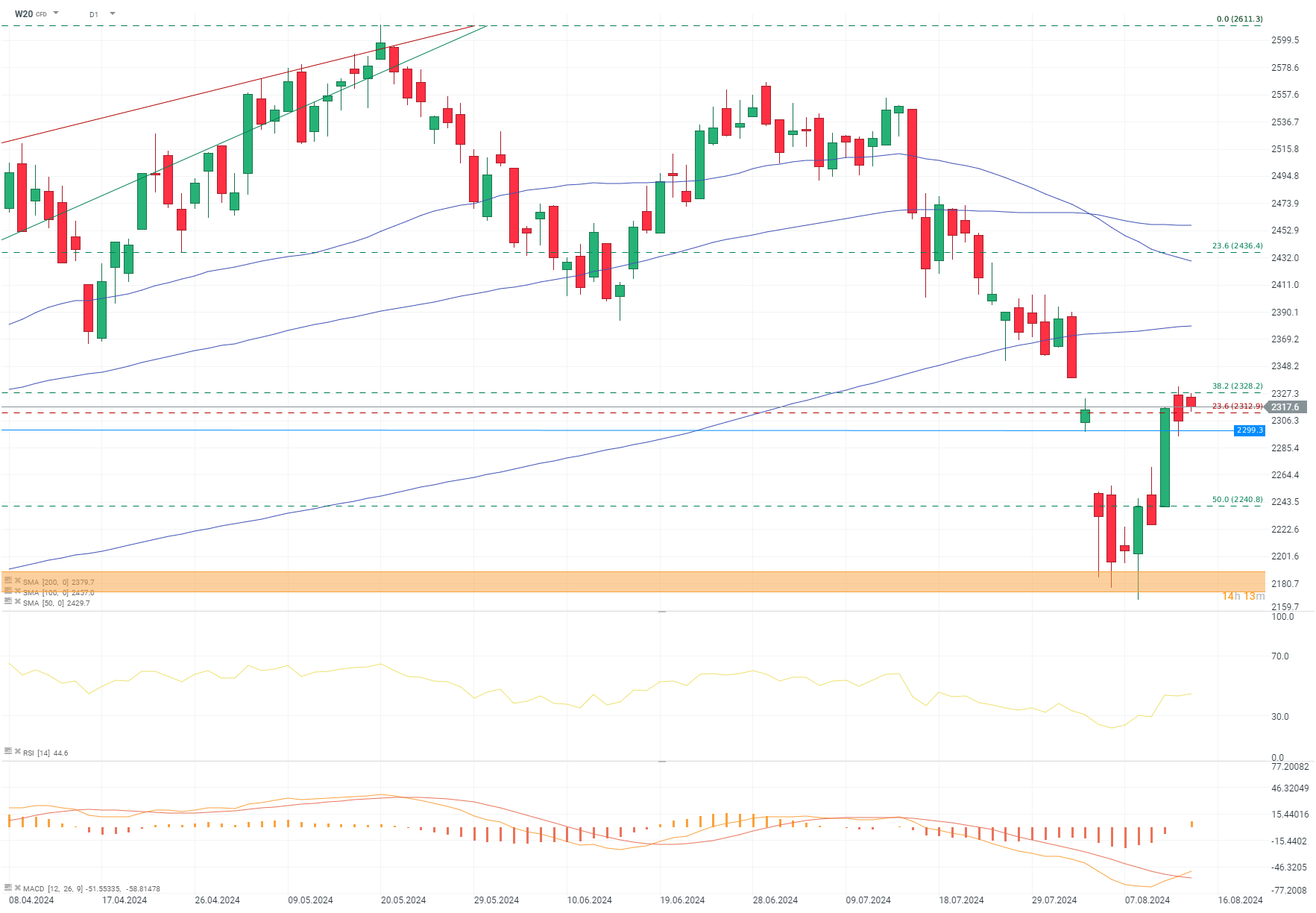 Kontrakt na WIG20 (W20) podczas wczorajszej sesji przebił wsparcie na poziomie 23,6% zniesienia Fibonacciego i zamknął się poniżej. Dzisiaj otworzył się przy 38,2% zniesieniu Fibonacciego i rozpoczął lekkie spadki. Oba te zniesienia będą znowu działać jako odpowiednio wsparcie i opór. Zejście poniżej 2312 otworzy drogę do 2299, czyli najniższego poziomu z piątku przed mocnymi spadkami. Z kolei przebicie oporu na 38,2% zniesienia Fibonacciego otworzy drogę do testu 200 SMA na wysokości 2378. RSI powoli stabilizuje się powyżej 44. MACD znalazło się dzisiaj na plusie po raz pierwszy od miesiąca, co warto obserwować jako sygnał potwierdzenia lub zaprzeczenia byczego nastawienia rynku. Źródło: xStation