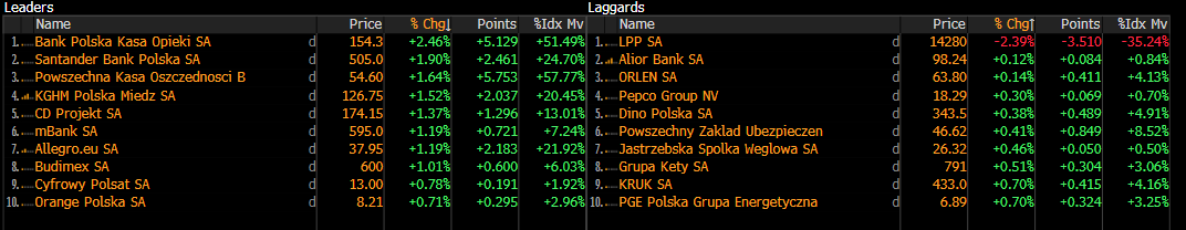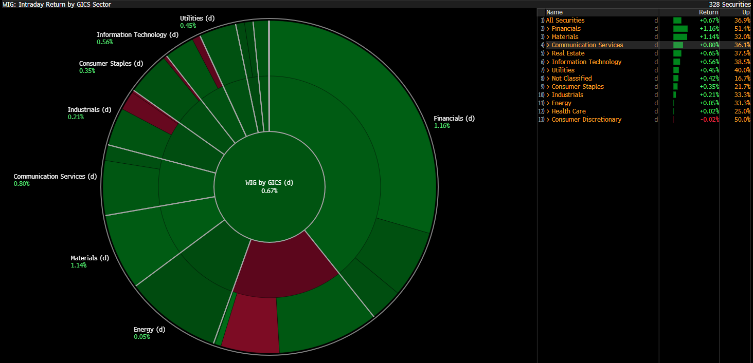 Najlepiej radzi dziś sobie sektor finansowy, który kontynuuje dobrą passę po wczoraj. Dadelo (DADA.PL) zwyżkuje o ponad 9% po opublikowaniu wyników. Mocno wzrastają również Rainbow Tours (RBW.PL) i Datawalk (DAT.PL), aż o 3%. Po przeciwnej stronie znajduje się Decora (DCR.PL), która traci ponad 4% po rozpoczęciu postępowania wyjaśniającego wszczętego przez Prezesa UOKiK.