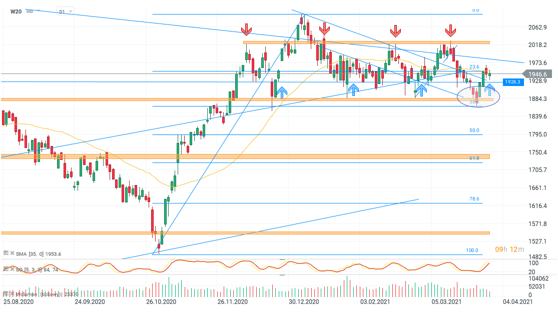 Technikalia na WIG20 (W20) pozostają niezmienne, indeks utrzymuje się w ruchu bocznym. Warszawski indeks blue chips pod koniec ubiegłego tygodnia przetestował ważny rejon przy 1875 pkt. Nie doszło do kontynuacji przeceny co potwierdza realizację scenariusza bazowego tj. konsolidacji w przedziale 1875 pkt - 2015 pkt.