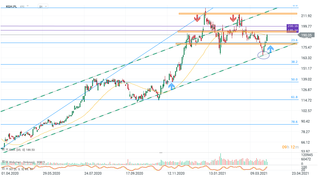 Dzisiejsza analiza techniczna zostanie poświęcona spółce KGHM Polska Miedź (KGH.PL). Obecnie sytuacja techniczna potwierdza kanał wzrostowy w ramach którego porusza się -od marca 2020 roku- opisywany walor. Patrząc na interwał D1, wzmocnienie popytu miało miejsce w rejonie 167 zł i na dzisiejszej sesji zmaga się z poziomem 190 zł. Jeżeli sytuacja na globalnych rynkach miedzi i srebra nie ulegnie znaczącemu pogorszeniu to istnieje szansa na test linii oporu 192 i kolejno 200 zł. Zadanie jest trudne z uwagi na podaż, która w wspomnianym rejonie, zdecydowanie dawała o sobie znać w 2011 oraz 2013 roku.