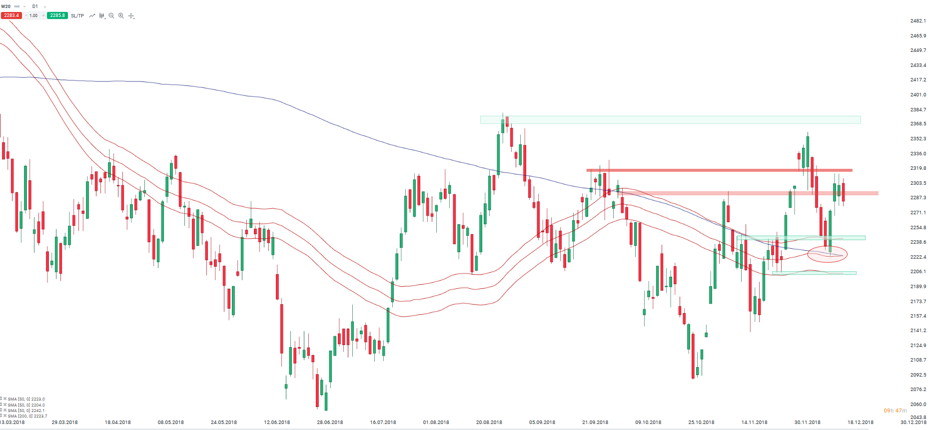 WIG20 (W20) ponownie kieruje się poniżej poziomu 2300 pkt. Źródło: xStation5.