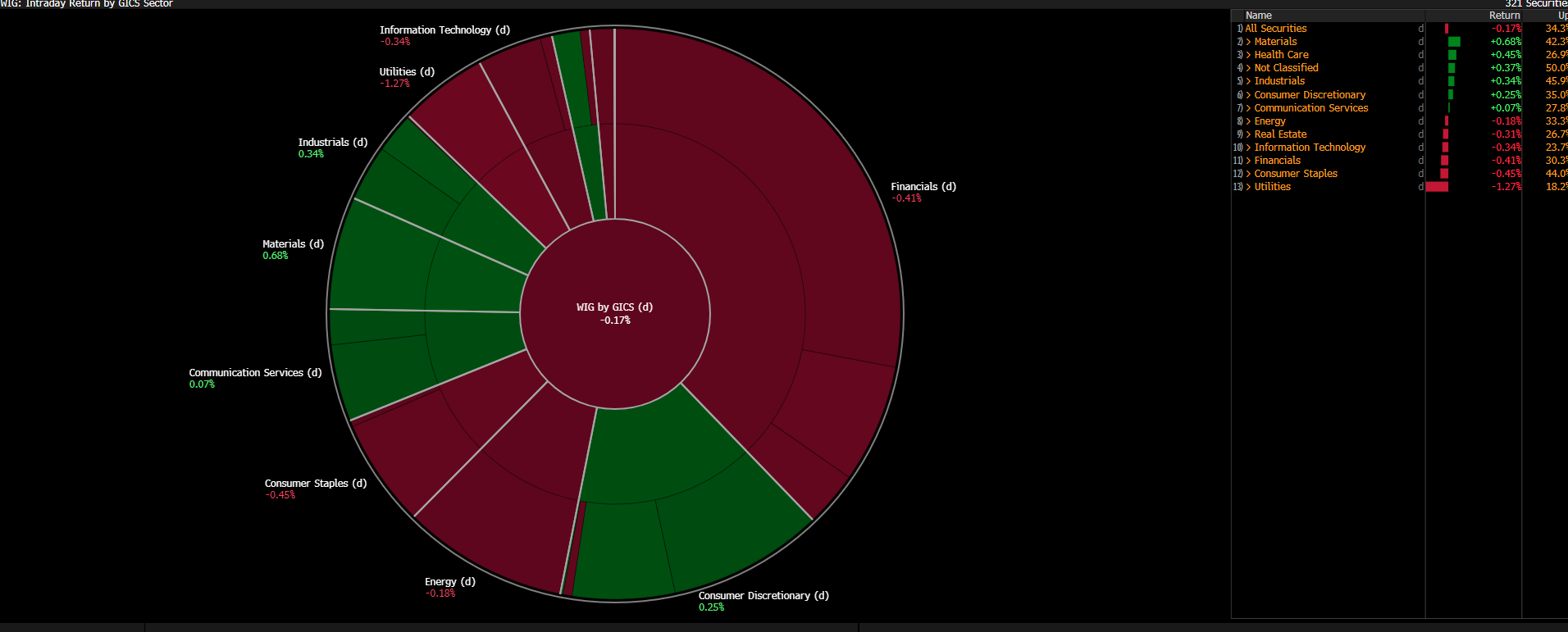 Dzisiejsza sesja na warszawskim parkiecie przebiega pod znakiem mieszanych nastrojów. Główne indeksy, takie jak WIG20 oraz szeroki WIG, wyraźnie tracą wobec wczorajszego zamknięcia, co odzwierciedla pewną niepewność wśród inwestorów. Pozostałe indeksy, mWIG40 oraz sWIG80, również odnotowują spadki, jednak są one znacznie mniej dotkliwe i wynoszą odpowiednio 0,2% oraz 0,1%. Taka sytuacja wskazuje na umiarkowane osłabienie na rynku, gdzie mniejsze spółki wykazują większą odporność na dzisiejsze czynniki wpływające na sentyment inwestorów.
