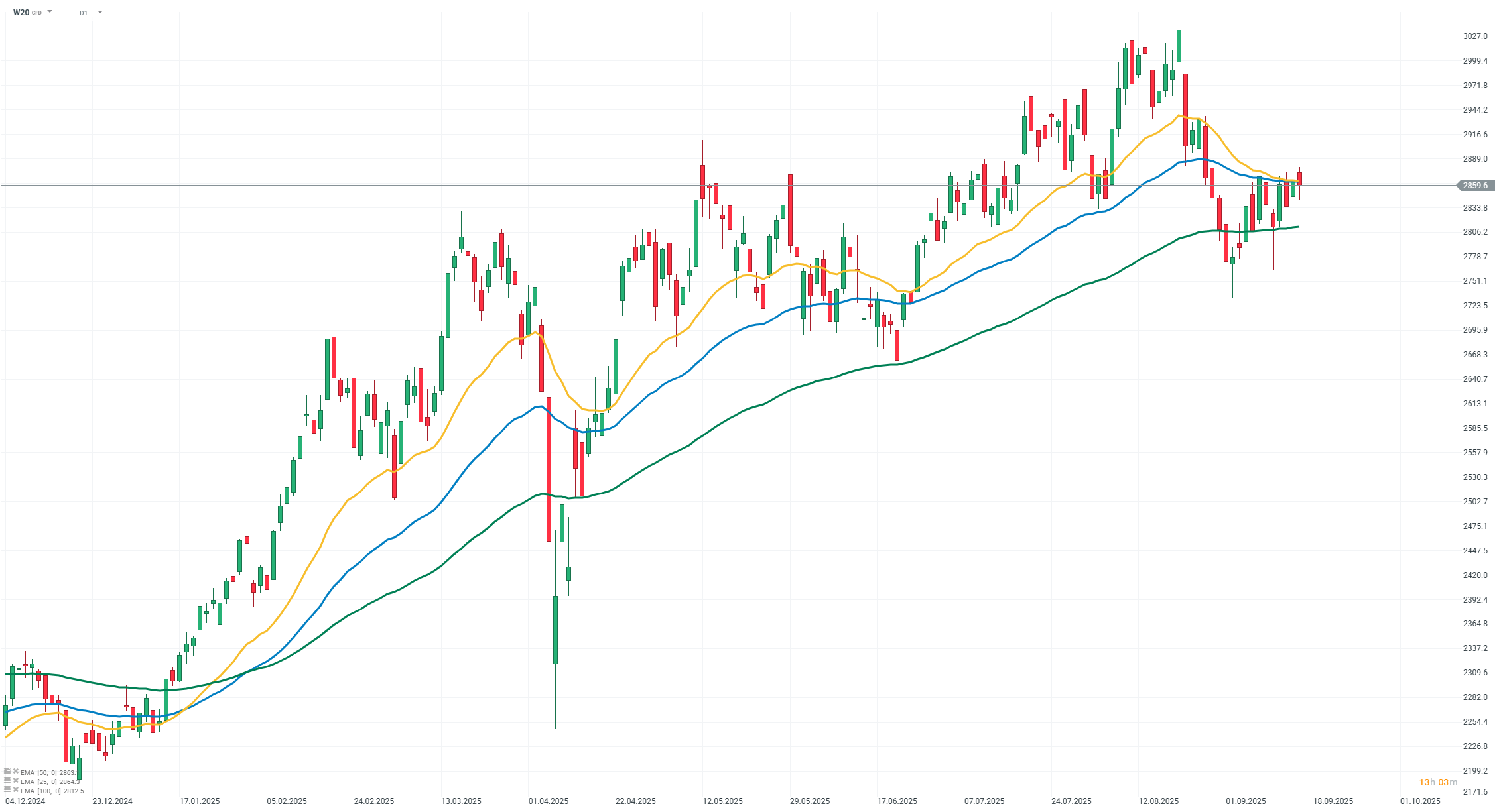 Kontrakty na WIG20 (W20) znajdują się obecnie w fazie konsolidacji, oscylując wokół kluczowych poziomów po niedawnym ruchu wzrostowym. Rynek oczekuje na nowy impuls, który zdecyduje o dalszym kierunku notowań, zarówno kontynuacji wzrostów, jak i ewentualnej korekty. Takim impulsem będzie nadchodząca decyzja FED w sprawie stóp procentowych, która może znacząco wpłynąć na nastroje inwestorów i kształt dalszego trendu. W tej chwili inwestorzy uważnie obserwują czynniki fundamentalne oraz te kluczowe wydarzenia, które mogą przełamać obecne zastoje.
