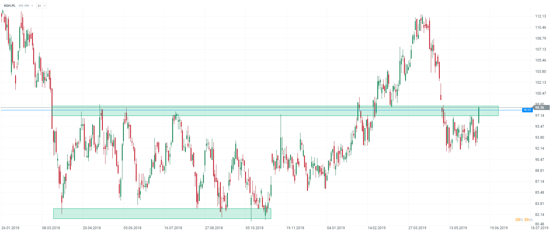 Na uwagę we wtorek zasługuje KGHM, który rośnie ponad 3%, jest to dużo lepszy wynik od całego indeksu. Kurs akcji dociera do istotnego miejsca, które może nadać kierunek w średnim terminie. Spoglądając na interwał czasowy – D1, cena znajduje się w kluczowej strefie. Jeżeli dziś, bądź w kolejnych dniach dojdzie do jej wybicia, to wzrosty mogą przyspieszyć. Z drugiej strony, jeżeli opór będzie broniony, podaż może przejąć kontrolę i sprowadzić cenę na ostatnie minima. W przypadku rozważania pozycji długich najlepiej byłoby poczekać na wybicie poziomu 98 zł, retest, a następnie dopiero dołączać do wzrostów. Jednak biorąc pod uwagę ostatnią lokalną konsolidację, rynek może równie dobrze wybić poziom i kontynuować wzrosty bez wykonania korekty. Ruch boczny trwał od 9 maja, dziś kupujący mają szasnę na jego zkończenie.