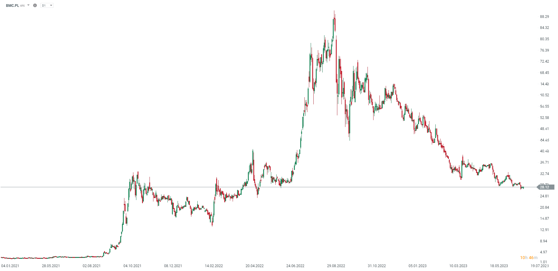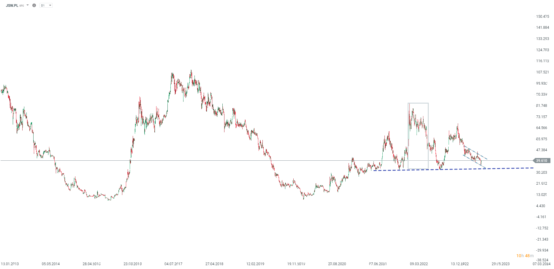 Akcje spółki odbijają drugi dzień z rzędu, ale jest to odrabianie strat związanych z ogłoszeniem podatku solidarnościowego. Teoretycznie opór znajduje się w okolicach górnego limitu spadkowego kanału przy poziomie 42 zł za akcje. Wsparcie w okolicach 33 zł, gdzie znajduje się linia szyi, choć zasięg formacji jest tak duży, że akcje miałyby spaść do ujemnego poziomu wg formacji, choć oczywiście nie jest to możliwe (pamiętajmy, że możliwe są np. spadki cen kontraktów terminowych na surowce do poziomów ujemnych, choć jest to anomalia). Źródło: xStation5