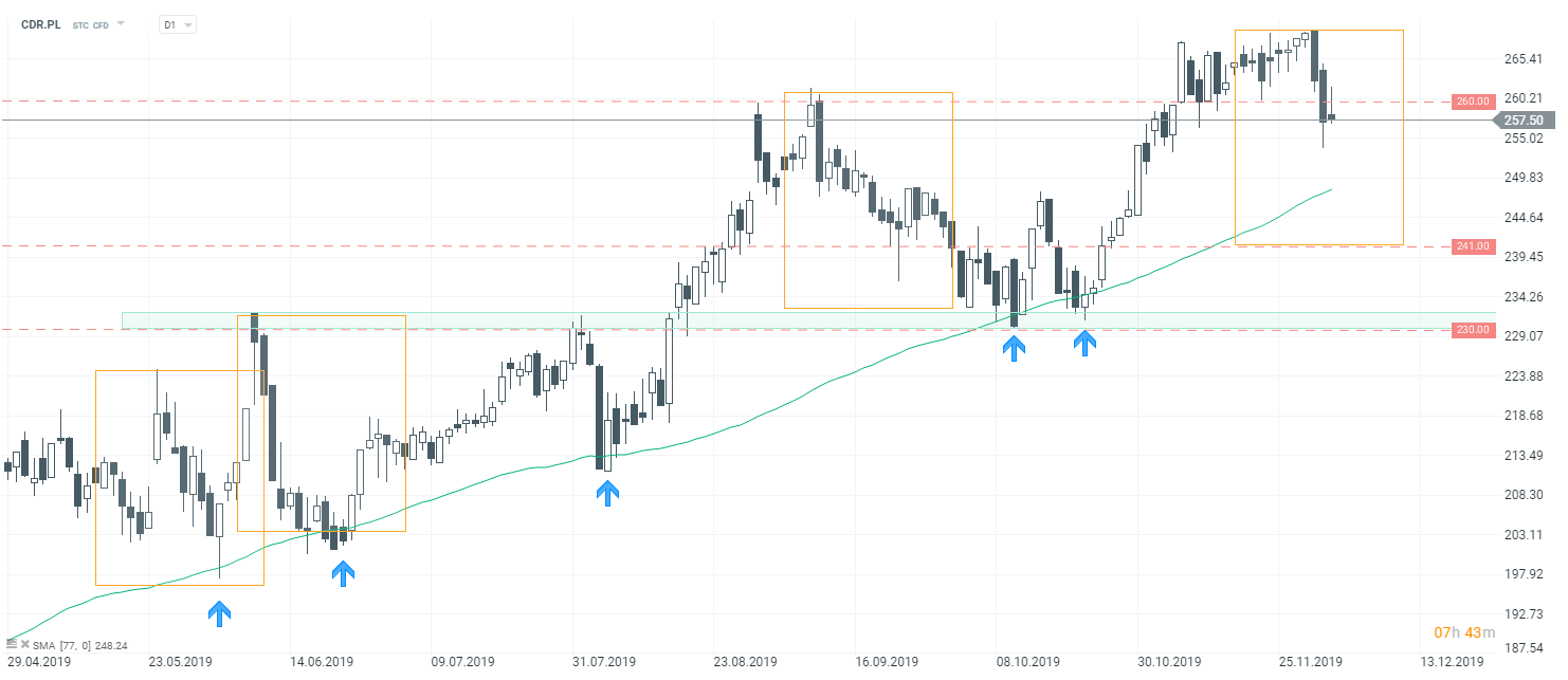 Kurs CD Projekt (CDR.PL) wyraźnie tąpnął w ubiegły piątek, paski były także kontynuowane podczas wczorajszej sesji. W zaledwie dwa dni handlowe akcje potaniały o 5%. Jeżeli chodzi o dziś, notowania utrzymują się nieznacznie pod kreską, niemniej sytuacja nie techniczna wygląda ciekawie. Notowania cofnęły się poniżej poziomu 260 zł, czyli maksimów z września tego roku. Tak długo jak kurs utrzymuje się poniżej,istnieje szansa na pogłębienie przeceny. Jako najbliższe wsparcie należy wziąć pod uwagę średnią SMA 77, która od dłuższego czasu trzymała wzrosty. Fundamentalnie raczej nic się nie zmieniło, to co obserwujemy teraz na wykresie jest raczej realizacją zysków po osiągnięciu najwyższych poziomów w historii. Większa korekta spadków byłaby czymś zupełnie normalnym.