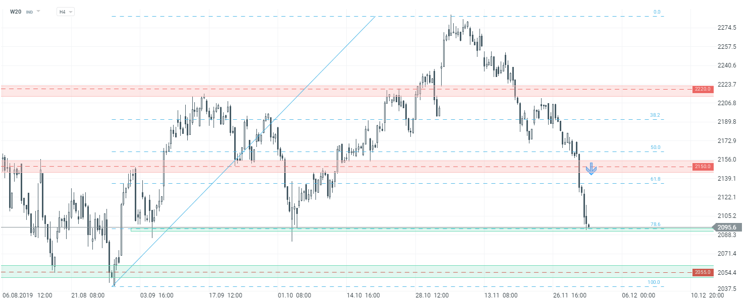 Sytuacja techniczna na indeksie WIG20 (W20) nie uległa większej zmianie. Kontrakt na indeks największych polskich spółek kontynuuje spadki. Dziś kurs znalazł się poniżej poziomu 2100 pkt, docierając do lokalnego wsparcia przy współczynniku 78,6% ostatniej fali wzrostowej. Jeżeli dojdzie do wybicia dołem, to pojawi się spora szansa na dalszy ruch w kierunku minimów przy 2055 pkt. O powrocie do wzrostów można myśleć dopiero w momencie, gdy notowania zdołają wyjść powyżej strefy oporowej przy 2150 pkt.