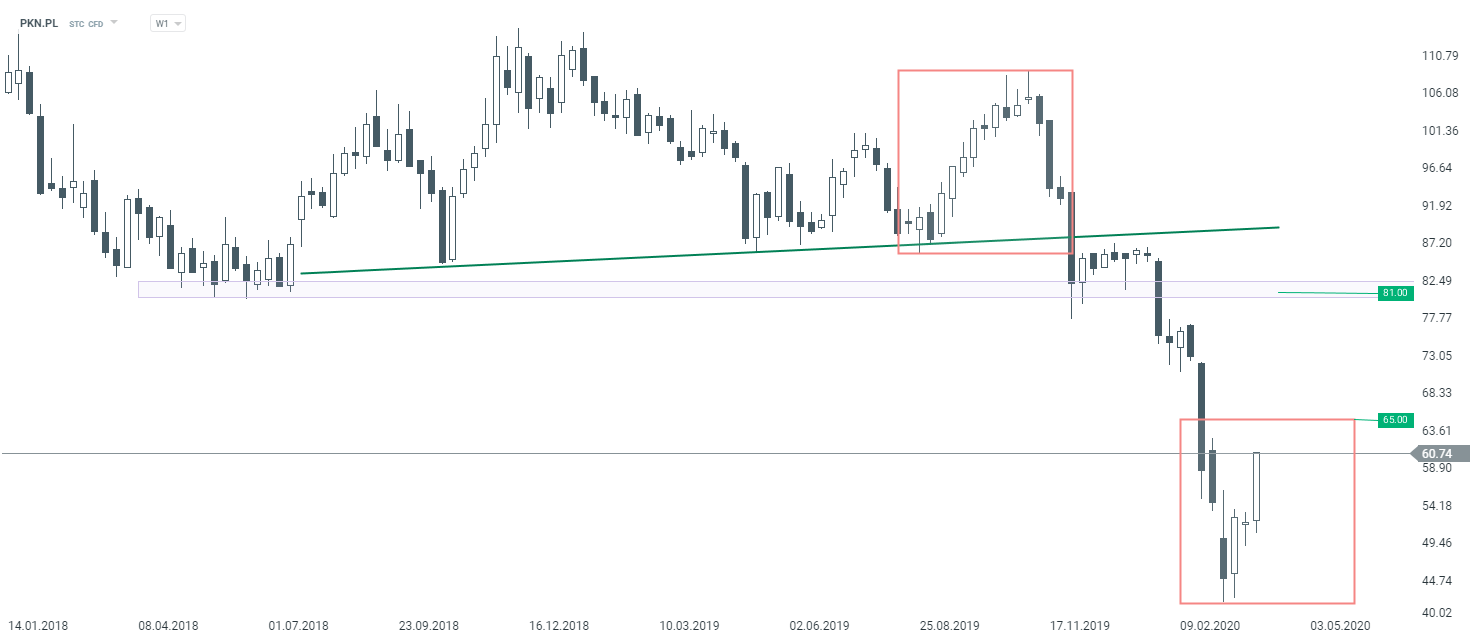 Najlepiej radzącą sobie dziś spółką z indeksu WIG20 jest PKN Orlen (PKN.PL), gdzie obserwujemy ruch na ponad 7 procent w górę. Ruch w górę jest wspierany przez informację dotyczącą modelowej marży downstrem grupy PKN Orlen, która wyniosła 15 dolarów na baryłkę w marcu, przy 9,8 USD miesiąc wcześniej i 11,1 USD w marcu ubiegłego roku. Patrząc technicznie na wykres tygodniowy, mamy do czynienia z dynamiczną korektą ostatnich silnych spadków. Jeżeli obecny sentyment nie ulegnie zmianie, to jako kluczowy opór należy traktować górne ograniczenie układu Overbalance, które znajduje się przy 65 zł za jedną akcję. Dopiero wyjście powyżej otworzyłoby drogę do testu strefy podażowej przy 81 zł.
