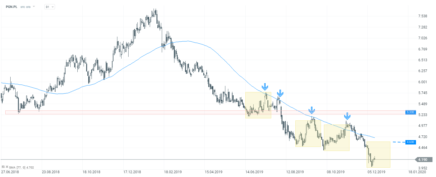 Patrząc na poszczególne spółki, wyraźne wzrosty widać dziś na PKO BP, gdzie ruch wynosi ponad 2%. Nie jest to jednak najlepiej radzący sobie walor. Po weekendowej wypowiedzi Jacka Sasina, który zdementował plotki o połączeniu PGNiG i Tauron, najsilniej w poniedziałek zyskuje właśnie Turon (+5,9%). Z kolei Polskie Górnictwo Naftowe i Gazownictwo nie radzi sobie tak dobrze, spółka znajduje się dziś 0,2% pod kreską. Jeśli chodzi o sytuację typowo techniczną, to PGNiG wciąż pozostaje w trendzie spadkowym. Odbicie z czwartku i piątku jest jak na razie bardzo niewielkie, a chęci do wzrostów podczas dzisiejszej sesji brakuje. Niemniej, gdyby doszło do większej korekty wzrostowej, należy pamiętać o poziomie 4,6 zł, gdzie znajduje się górne ograniczenie układu Overbalance. W bliskiej okolicy tego poziomu znajduje się także średnia z ostatnich 77 okresów, która przez dłuższy czas utrzymywała trend spadkowy. Dlatego też aby myśleć o większym odbiciu, rynek musiałby wyjść powyżej. Jak na razie trend pozostaje spadkowy, a łapanie “spadającego noża” nie wydaje się dobrym pomysłem.