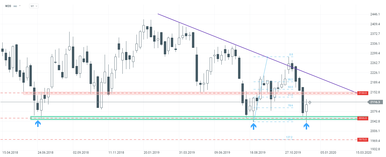 Jeżeli chodzi o sytuację techniczną na W20, kontynuowane jest odbicie od strefy wsparcia przy 2055 ptk. Wszystko wskazuje na to, że istnieje spora szansa na atak strefy oporowej przy 2150 pkt. Jeżeli doszłoby do jej pokonania, to kolejną przeszkodą powinna być linia poprowadzona po ostatnich szczytach, dopiero jej pokonanie zmieniłoby sytuację w średnim terminie. Warto zaznaczyć, że pomimo silnego odbicia, obecnie obserwowany ruch jest jedynie korektą w tendencji spadkowej.