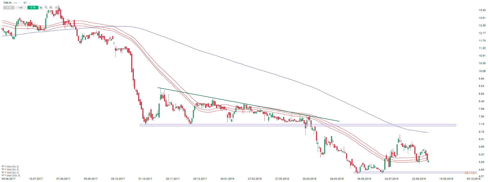 Torpol ponownie wychodzi poniżej kanału średnich 50-okresowych i kieruje się w okolice potencjalnego wsparcia w okolice 4,6 złotych. Źródło: xStation5.