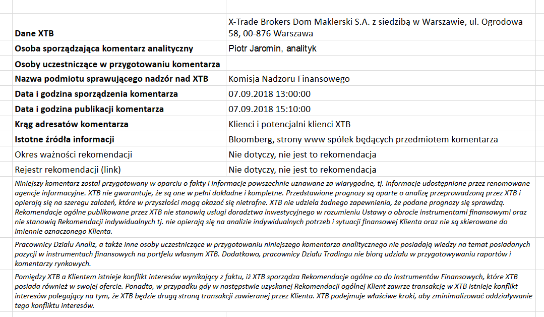 Regulamin sporządzania rekomendacji (link)Ta publikacja handlowa jest informacyjna i edukacyjna. Nie jest rekomendacją inwestycyjną ani informacją rekomendującą lub sugerującą strategię inwestycyjną. W materiale nie sugerujemy żadnej strategii inwestycyjnej ani nie świadczymy usługi doradztwa inwestycyjnego. Materiał nie uwzględnia indywidualnej sytuacji finansowej, potrzeb i celów inwestycyjnych klienta. Nie jest też ofertą sprzedaży ani subskrypcji. Nie jest zaproszeniem do nabycia, reklamą ani promocją jakichkolwiek instrumentów finansowych. Publikację handlową przygotowaliśmy starannie i obiektywnie. Przedstawiamy stan faktyczny znany autorom w chwili tworzenia dokumentu. Nie umieszczamy w nim żadnych elementów oceniających. Informacje i badania oparte na historycznych danych lub wynikach oraz prognozy nie stanowią pewnego wskaźnika na przyszłość. Nie odpowiadamy za Twoje działania lub zaniechania, zwłaszcza za to, że zdecydujesz się nabyć lub zbyć instrumenty finansowe na podstawie informacji z tej publikacji handlowej. Nie odpowiadamy też za szkody, które mogą wynikać z bezpośredniego czy też pośredniego wykorzystania tych informacji. Inwestowanie jest ryzykowne. Inwestuj odpowiedzialnie.