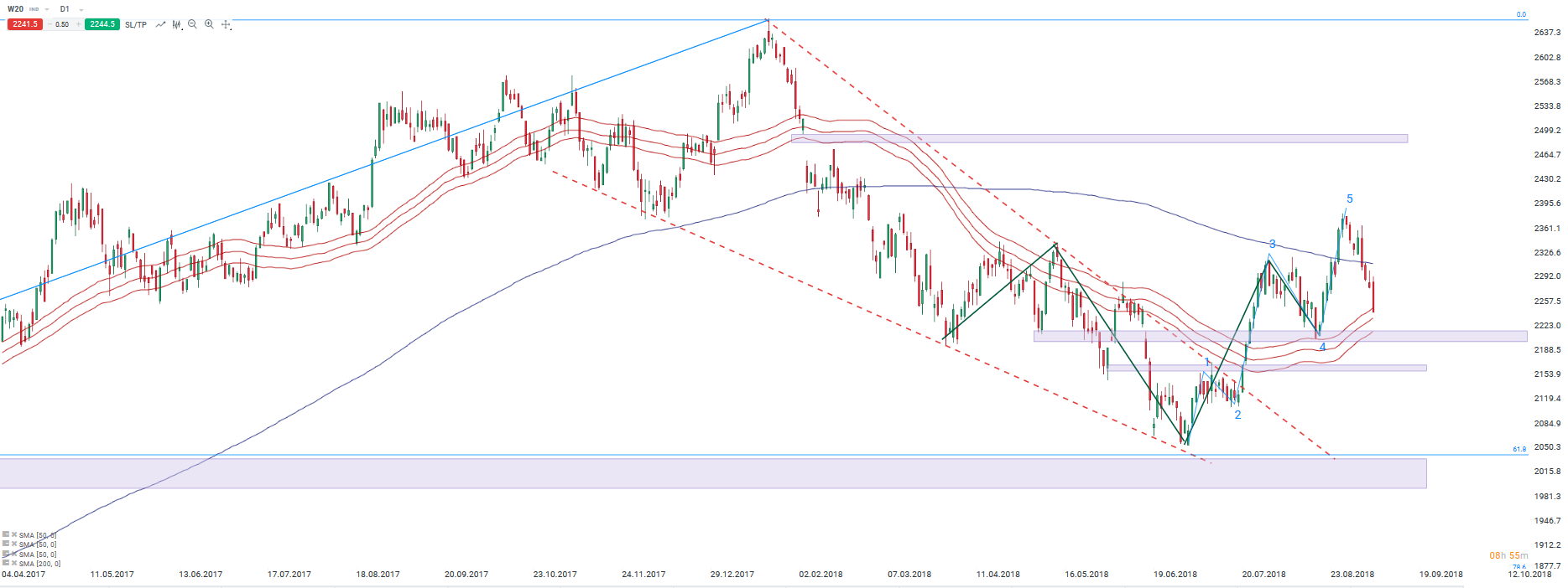 WIG20 (W20 na xStation5) schodzi w kierunku kanału średnich 50-okresowych