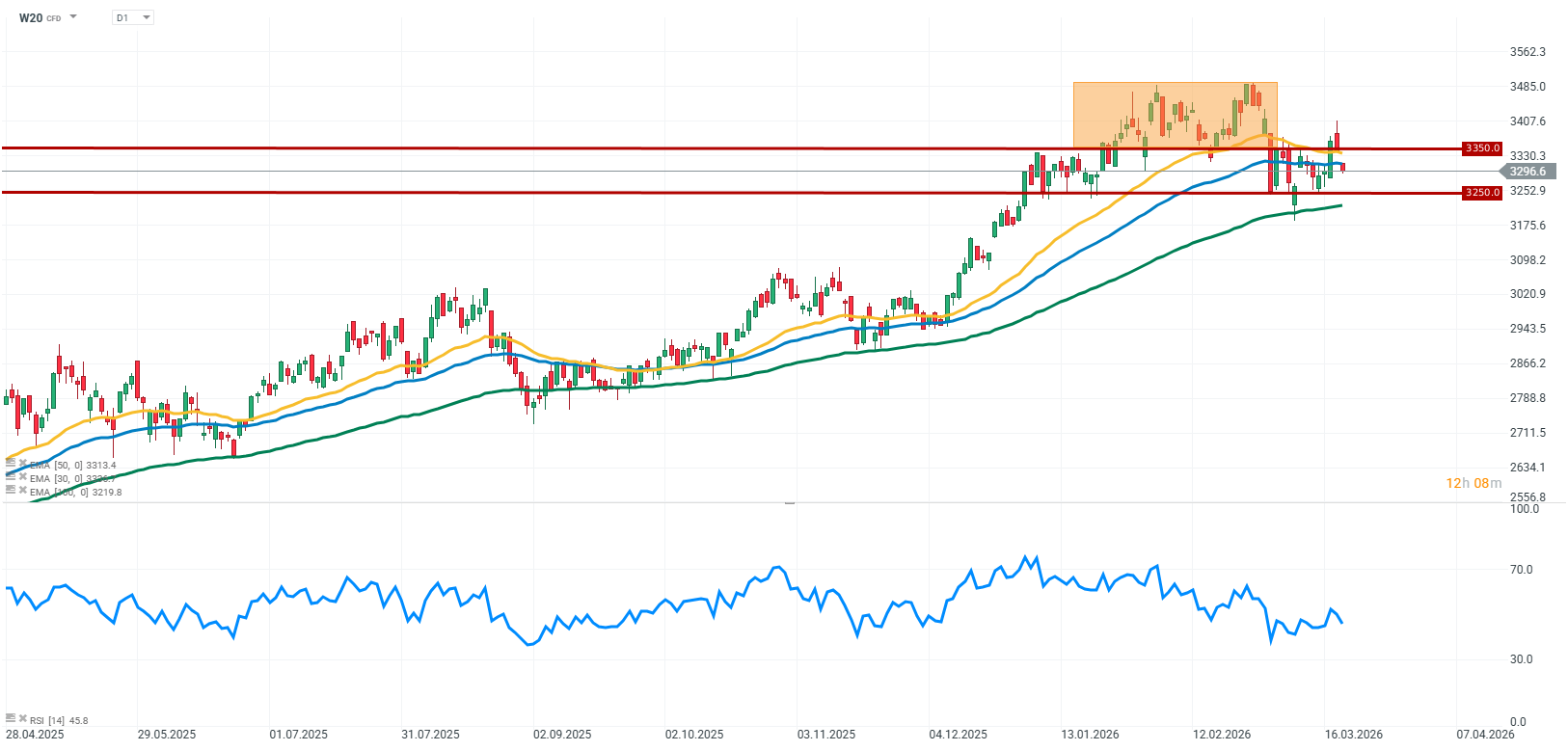 Czwartkowa sesja na warszawskiej giełdzie przebiega pod znakiem wyraźnych spadków, co wpisuje się w pogorszenie globalnego sentymentu. Na godzinę 12:00 indeks WIG traci około 1,2%, WIG20 spada o ponad 1,3%, natomiast mWIG40 i sWIG80 zniżkują odpowiednio o około 1,2% i 1%. Presja podażowa wynika przede wszystkim z eskalacji napięć geopolitycznych w Zatoce Perskiej, które doprowadziły do silnego wzrostu cen ropy naftowej powyżej poziomu 110 USD za baryłkę, a obecnie w okolice 115 USD. Dodatkowym czynnikiem ryzyka był wczorajszy atak Izraela na jedne z największych złóż gazu ziemnego w Iranie, co zwiększyło obawy o stabilność dostaw surowców energetycznych i negatywnie wpływa na globalne nastroje.
