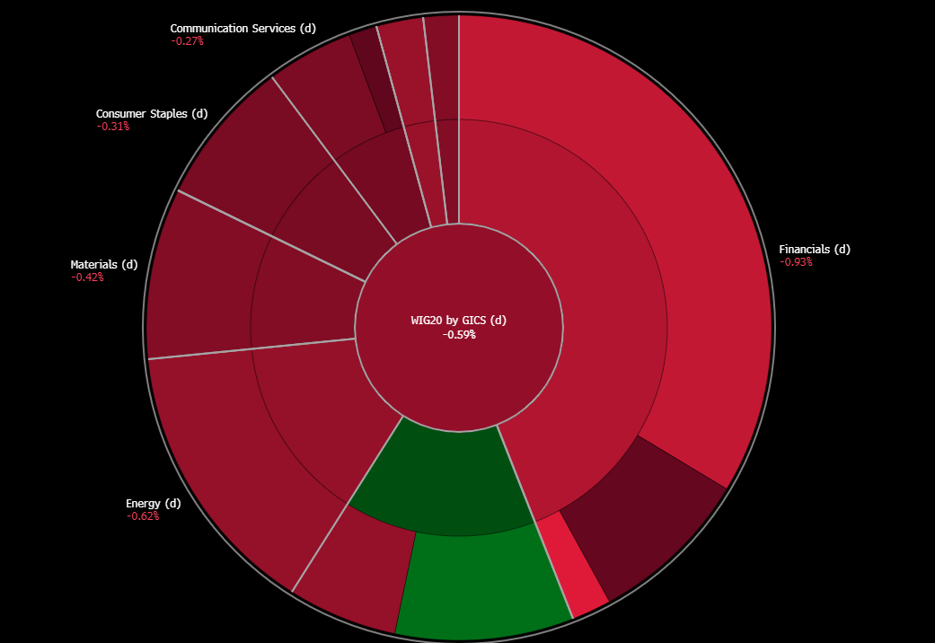 - Główne indeksy WIG, WIG20 i mWIG40 notują spadki, WIG20 oscyluje wokół 3 000 punktów, a najsłabsze sektory to banki i energetyka.